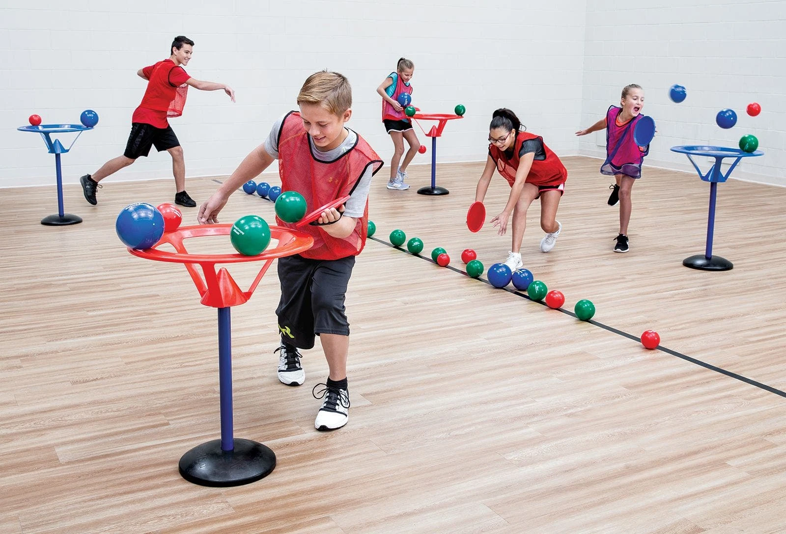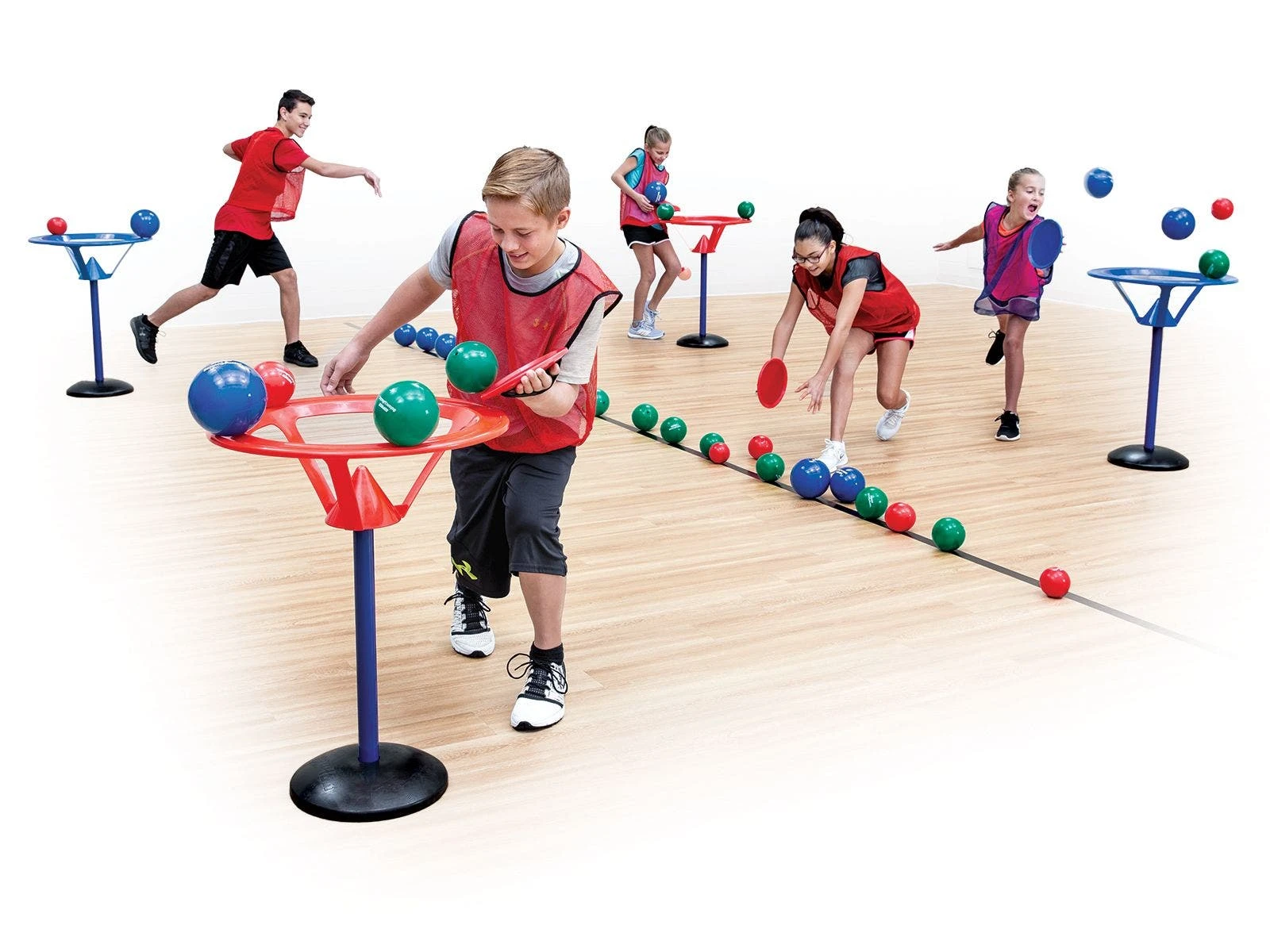 Set includes 4 goals with rubber bases (2 ea red, blue; 36″H x 24″ dia), 24 paddles, 40 balls (20 ea 4″ dia; 10 ea 2.5″, 6″ dia), a VersaBag mesh storage bag, and activity instructions.