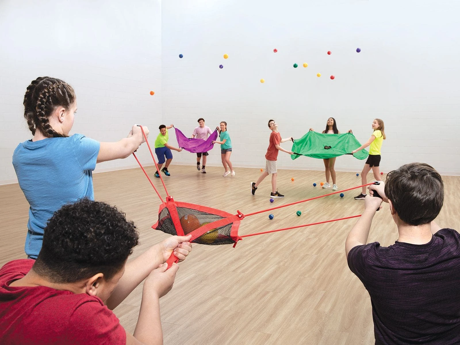Put teamwork and communication to the test as teams race to collect launched balls in parachutes. Assign six players to be neutral and serve as launchers, with three using each launcher. Divide the rest of the class into 6 equal teams and provide each with a parachute. As balls are launched, teams hurry to catch the most balls in their designated color. After catching a ball in the parachute, set it aside. If a ball is not caught in the parachute, it is considered out of play and not counted for points. Included activity instructions provide multiple game options and variations to increase or decrease the challenge.