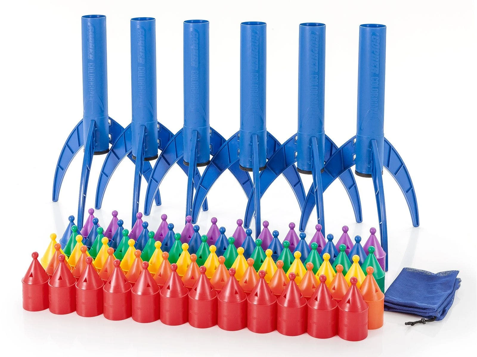 Tubes feature removable legs for easy storage and markers feature knob for better grip. Set includes 6 ColorCraze™ Tubes (36″H x 4″ dia), 12 Rainbow® Sets ColorCraze™ Markers (8”H x 4” dia), a VersaBag™ mesh storage bag and activity instructions.