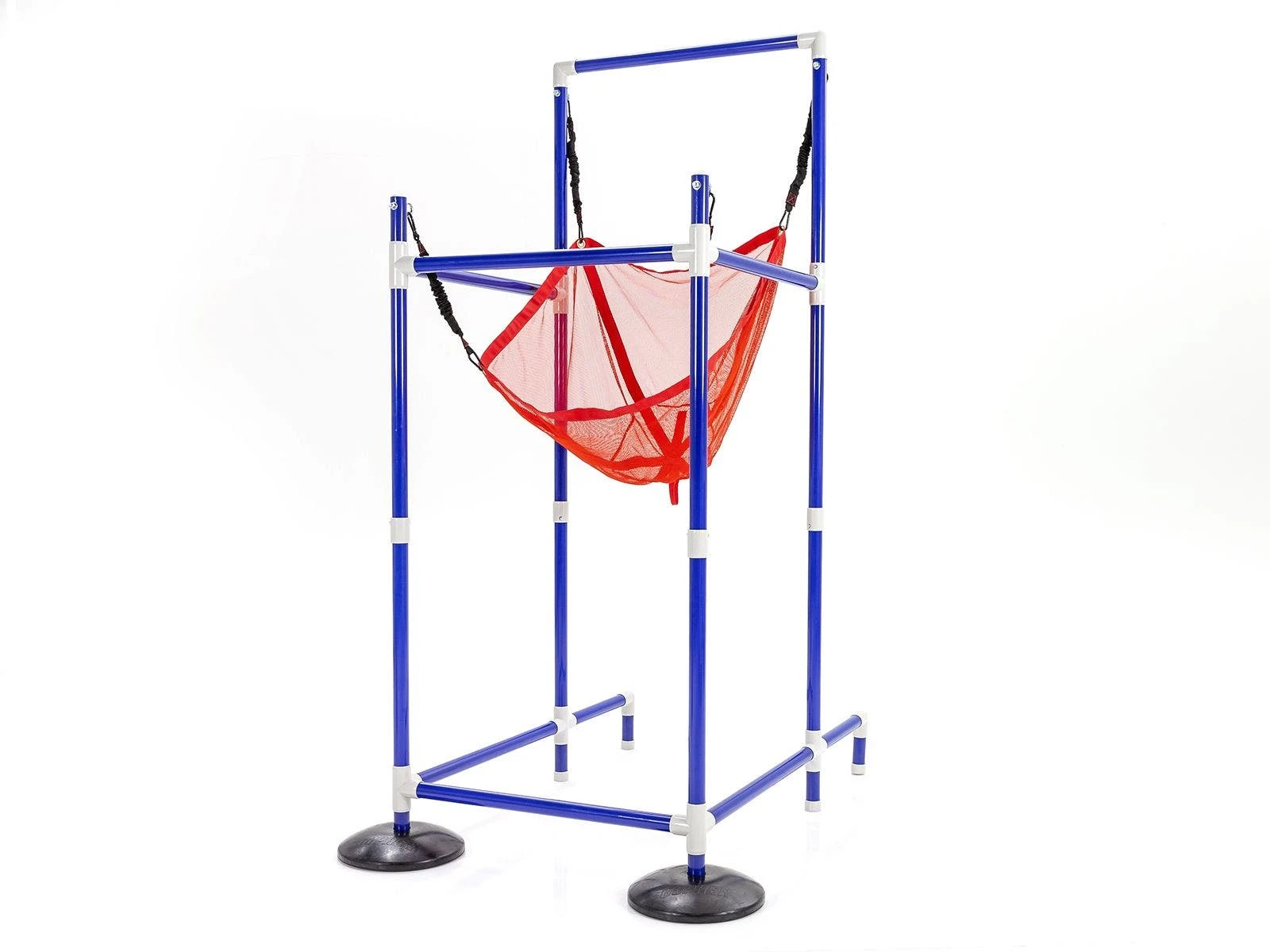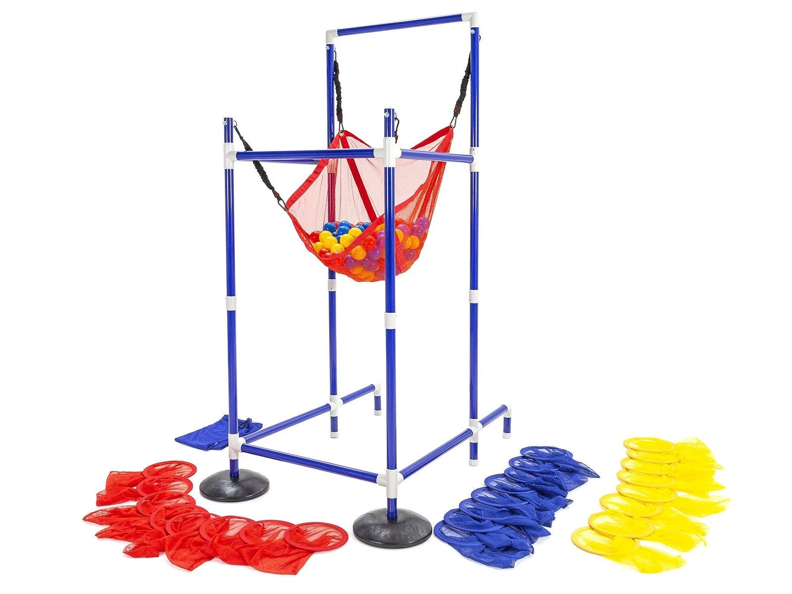 The launcher stands a towering 90″H, adding extra force and momentum to balls launched out of it. Two rubber bases keep it firmly in place during use. Color-coded nets and balls make team identification simple.