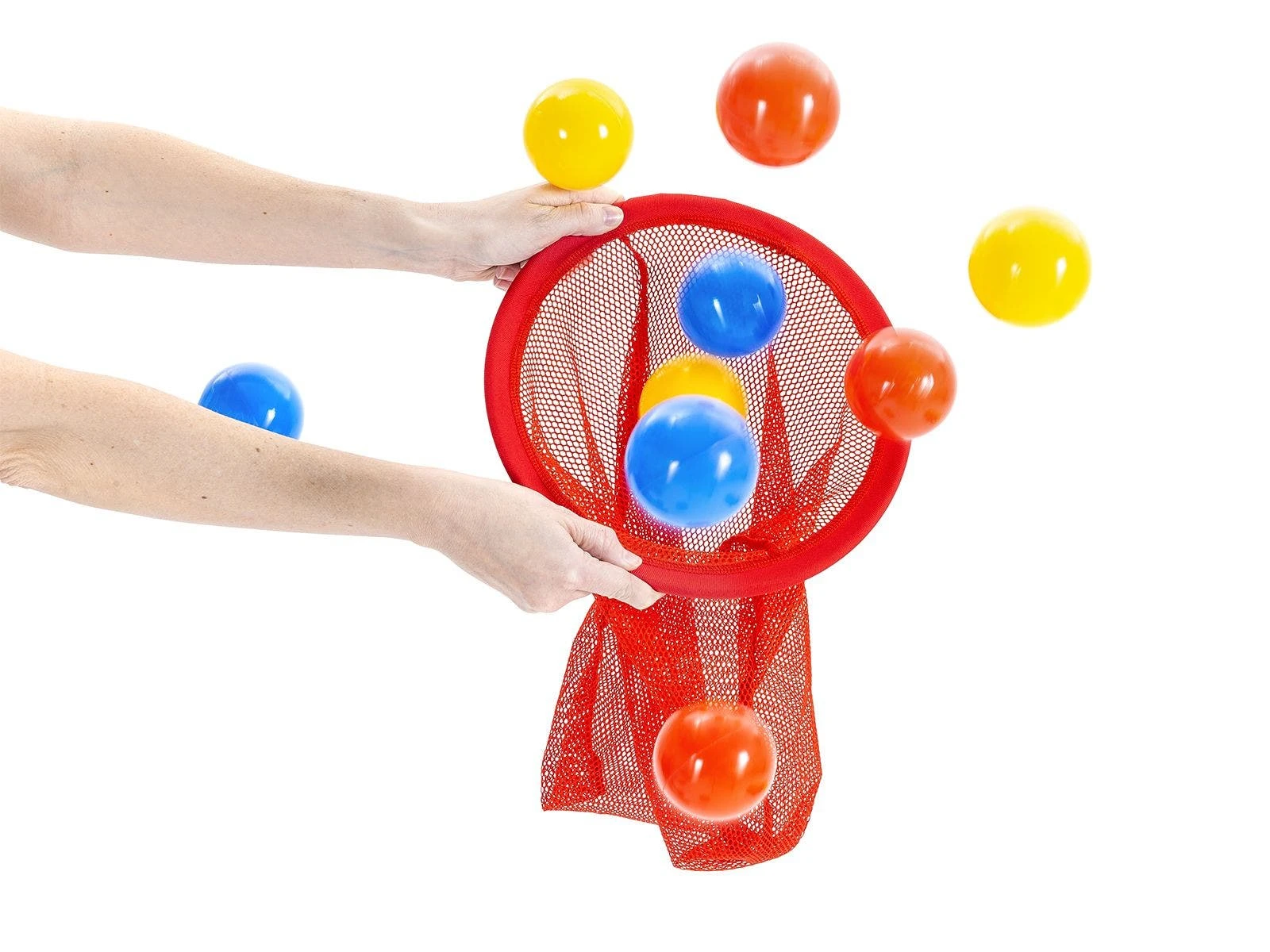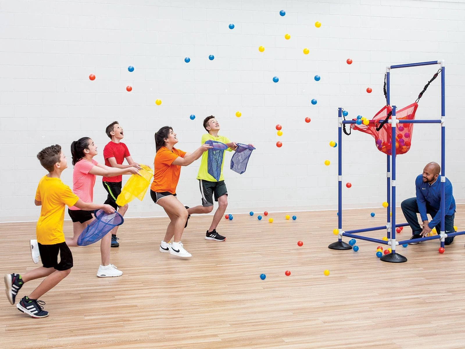 Three teams of students need to keep their eyes up and nets ready during a fast-paced ball launcher game! The instructor pulls down on the launcher basket to catapult dozens of small balls into the air. Players race to catch balls in their team color in a net, then place them in their team’s hoop. Each ball in a team’s color in its hoop is worth one point. If a player catches balls not in his/her team color, or if balls fall to the floor, they are returned to the instructor to get launched again. Play for a predetermined time or until all balls are collected. Create even more action by adding taggers. If a player is tagged while racing toward his/her team’s hoop, the player removes a ball from his/her net and gives it to the tagger. This is a great game to help players improve their teamwork skills and hand/eye coordination as they catch balls in the nets.