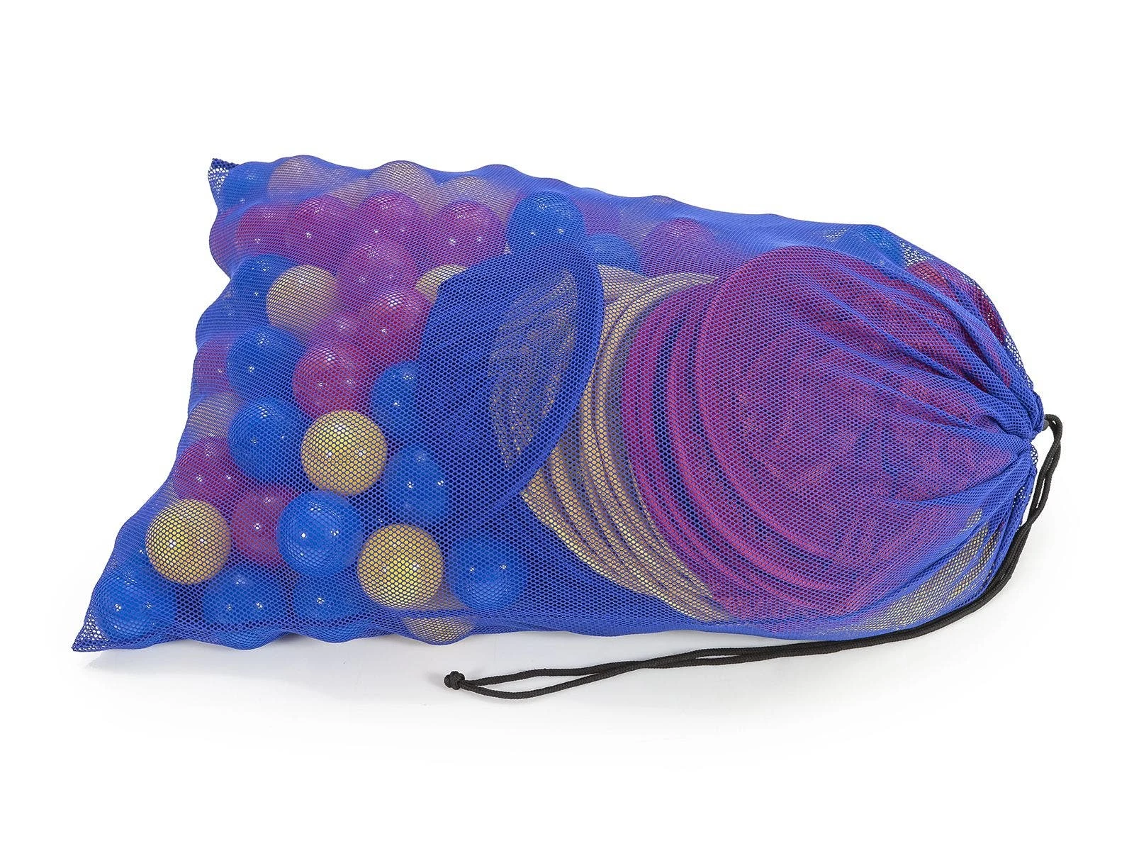 Set includes launcher (60-1/2″L x 48″W x 90″H; 45 lb), 2 rubber bases (15 lb ea), 24 nets (16″L x 10″ dia top), 175 hollow plastic balls (2.75″ dia), a VersaBag Mesh Storage Bag, and activity instructions.