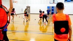 Teams compete during these target games to score the most points by hitting one of three hook-and-loop fastener targets on their team’s goal. All players start with a soft fabric ball stuck to the back of their pinnies. Players can choose to remove the ball to shoot or pass it to an open teammate for a shot. But watch out as opponents try to steal the ball off your back! Play until a team reaches a certain point total or for a specified amount of time.