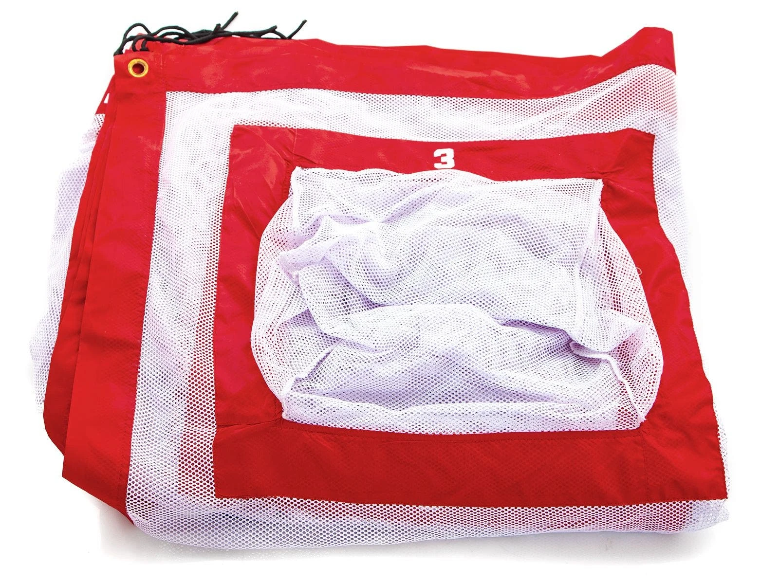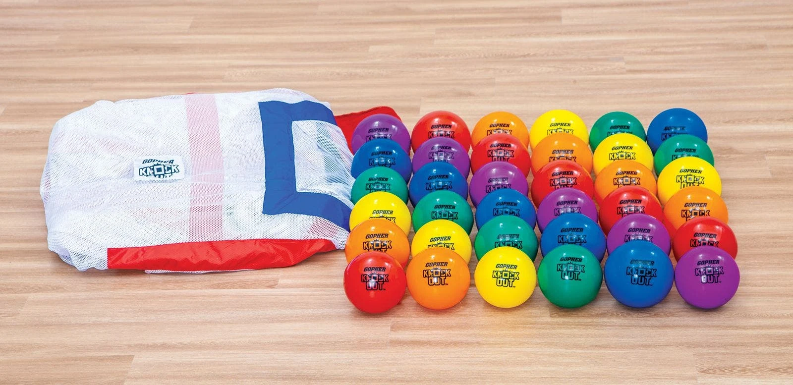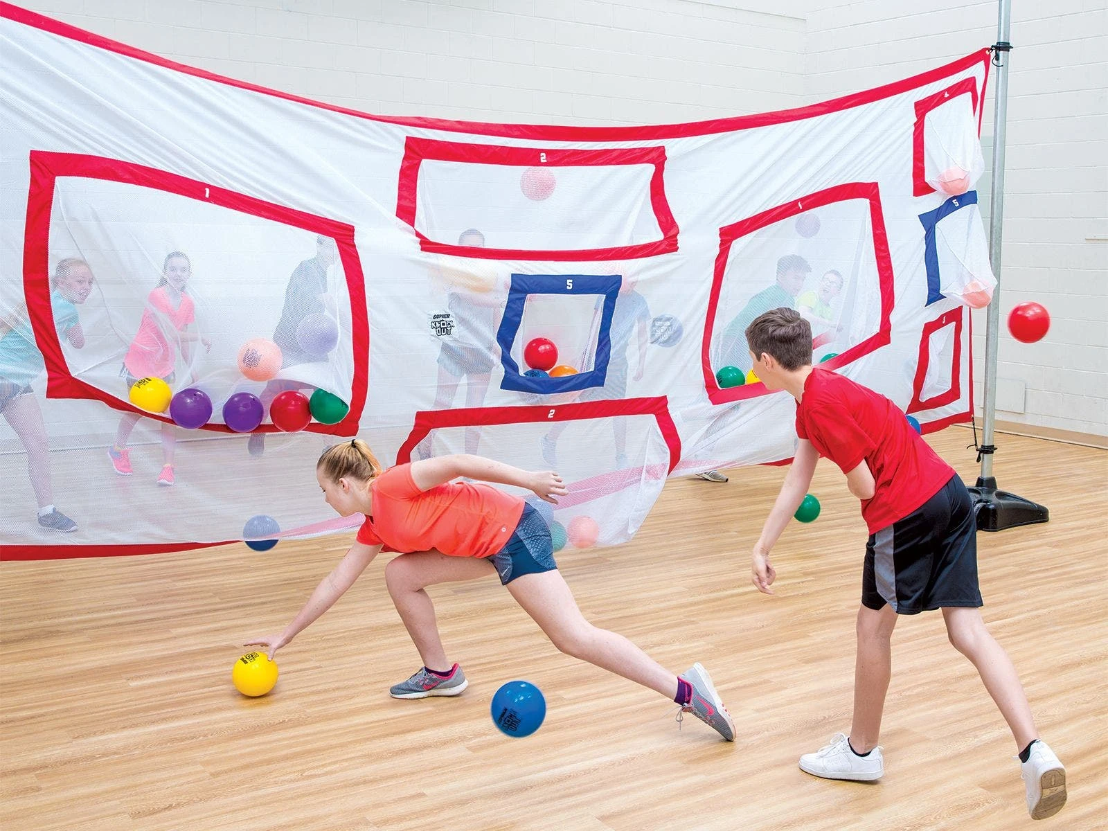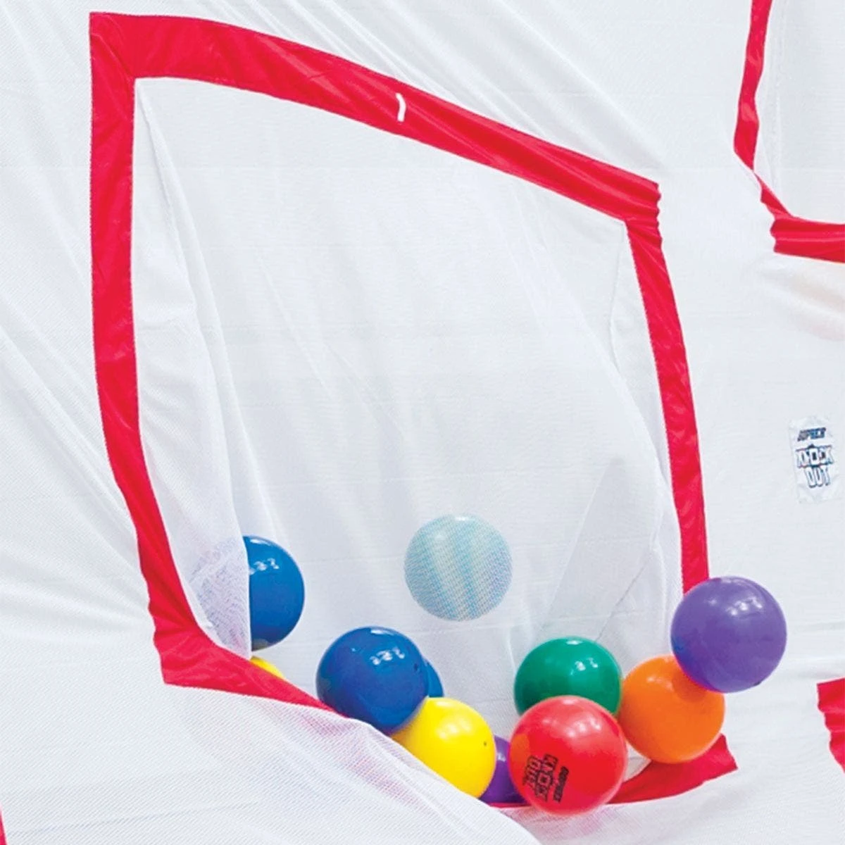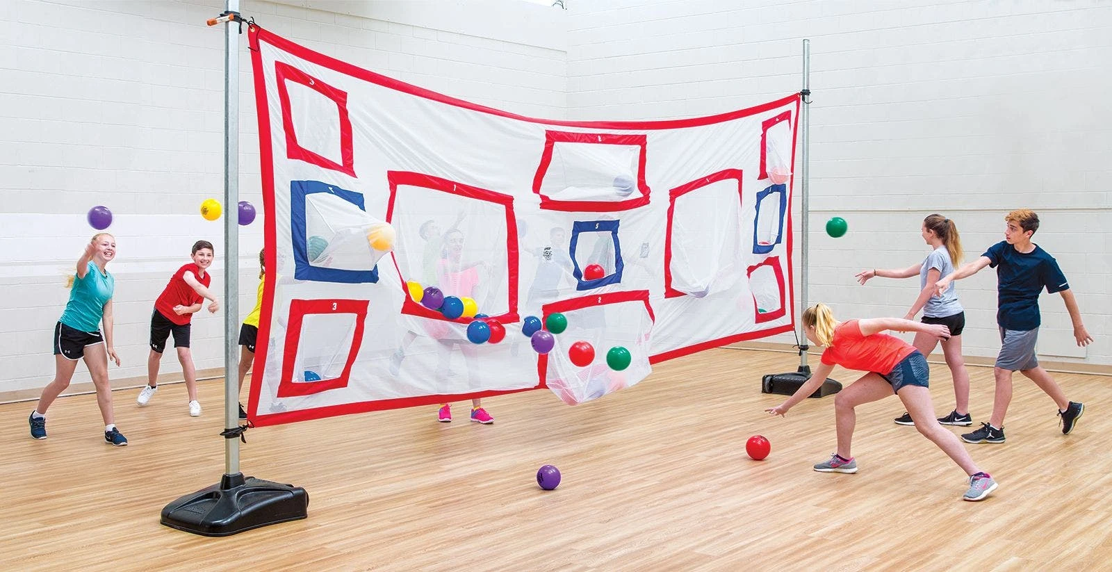 Teams throw vinyl balls at the divider’s mesh pockets, attempting to obtain possession and earn points. Knock out the other team’s balls from a pocket and possession flips! Eleven pockets vary in size, point values, and are shallow to increase the challenge. The team with the most points at the end of the game wins! Set includes 1 nylon divider (7’H x 20’W) that attaches to your existing standards, 36 Rainbow balls (7″ dia), a VersaBag mesh storage bag, and activity instructions.