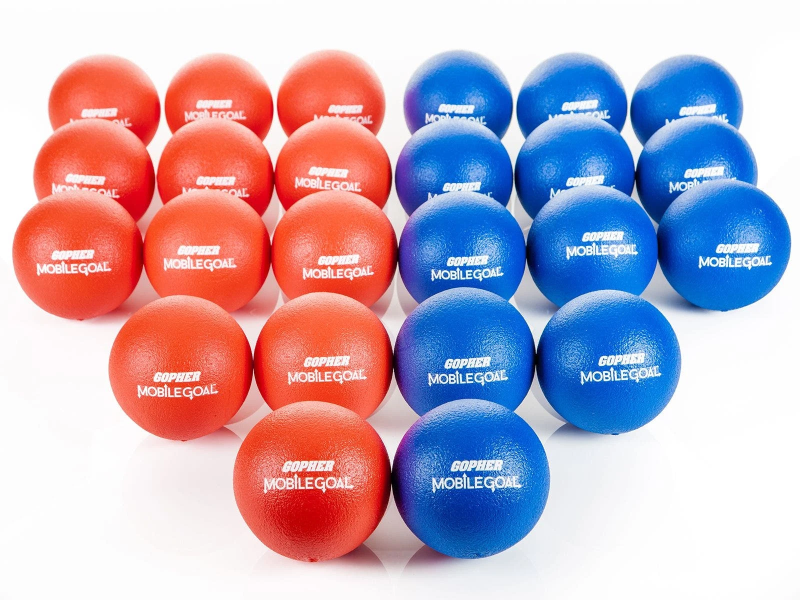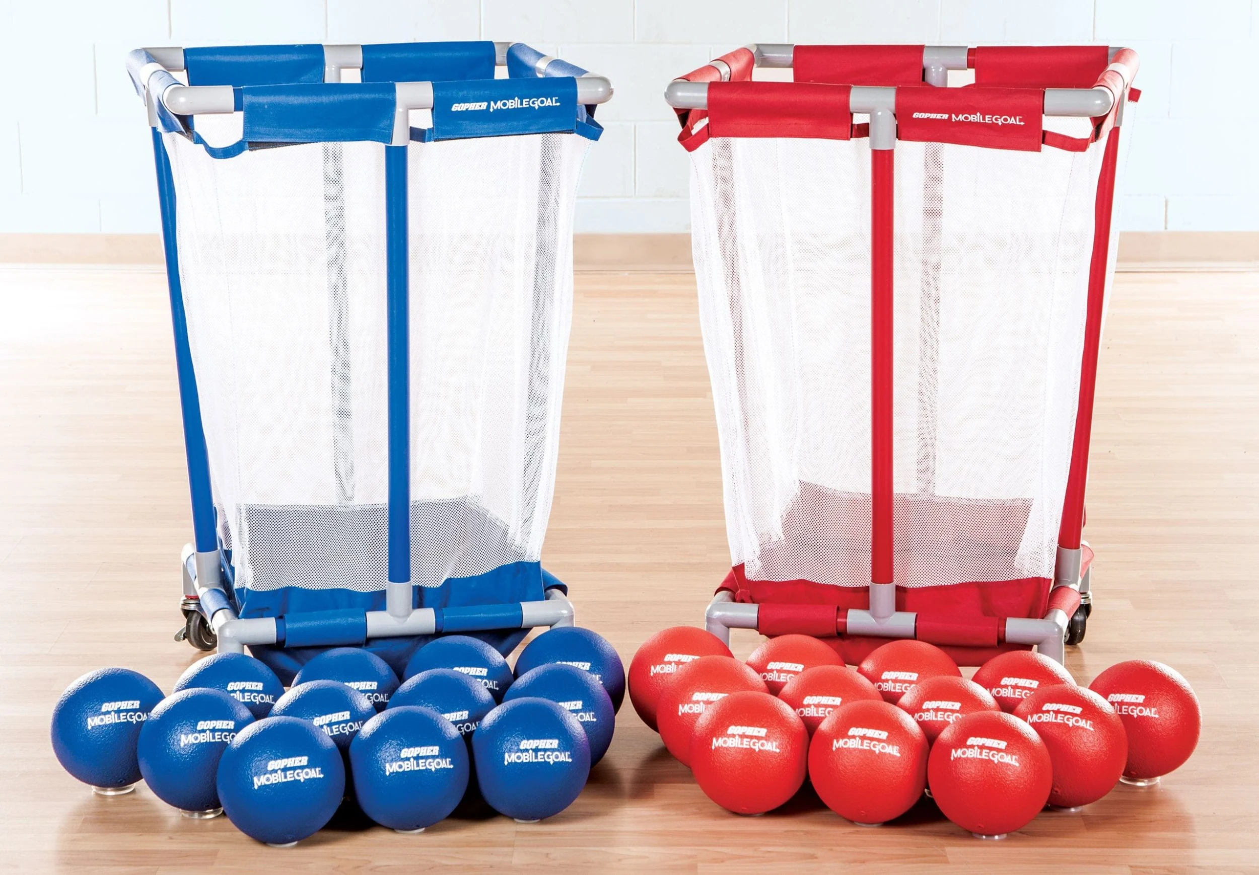 Set includes a pair of goals (24″ sq top, 20″ sq bottom, 38″H), 24 coated foam balls (6.3″ dia; 12 ea red, blue), and activity instructions.