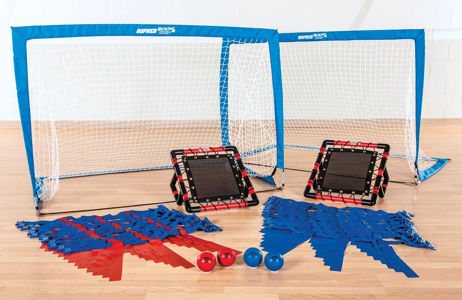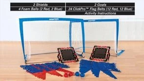 Set includes 2 shields (10″W x 20″H), 2 goals (48″W x 37″H x 37″D), 4 foam balls (3.5″ dia; 2 ea red, blue), 24 flag belts (12 ea red, blue), and activity instructions. Balls and shields also sold separately.