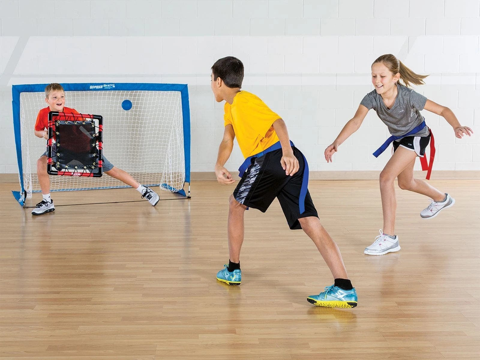 During RicochetRally, one player from each team serves as the goalie and uses the shield. Goalies are the only players allowed in the defensive area and use the shield to block balls from getting into the goal. Offensive players pass the ball to teammates to advance down the field. Defensive players attempt to stop opponents from scoring by intercepting the ball or removing a flag from a player’s belt while he/she is in possession of the ball. Players are not allowed to take more than 3 steps while holding the ball. Players without flags are on defense. The first team to score 10 points, or the team with the most points after a predetermined time wins!