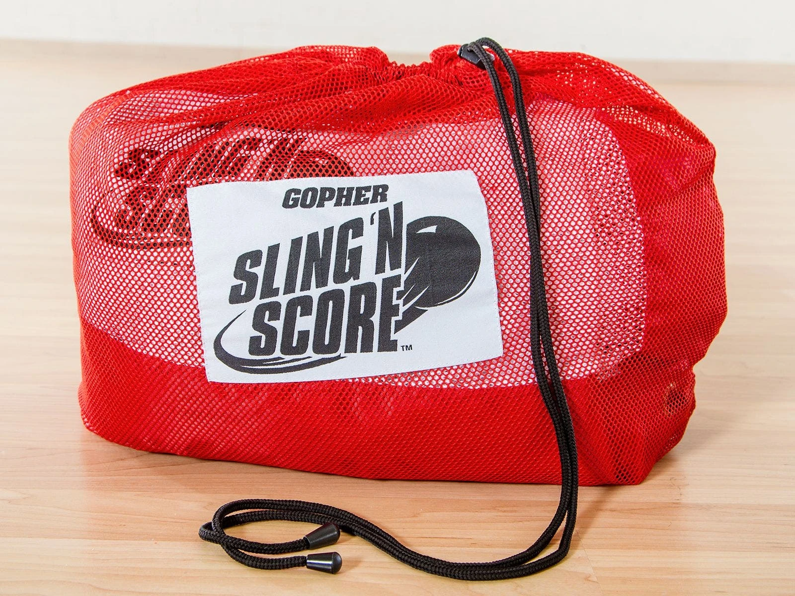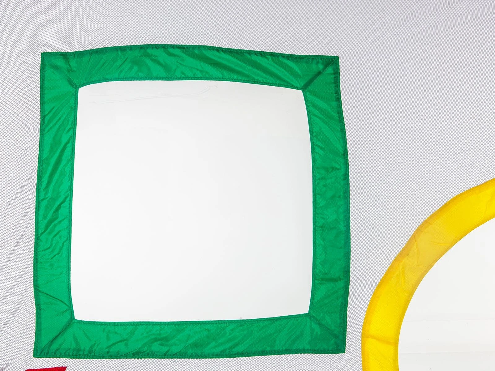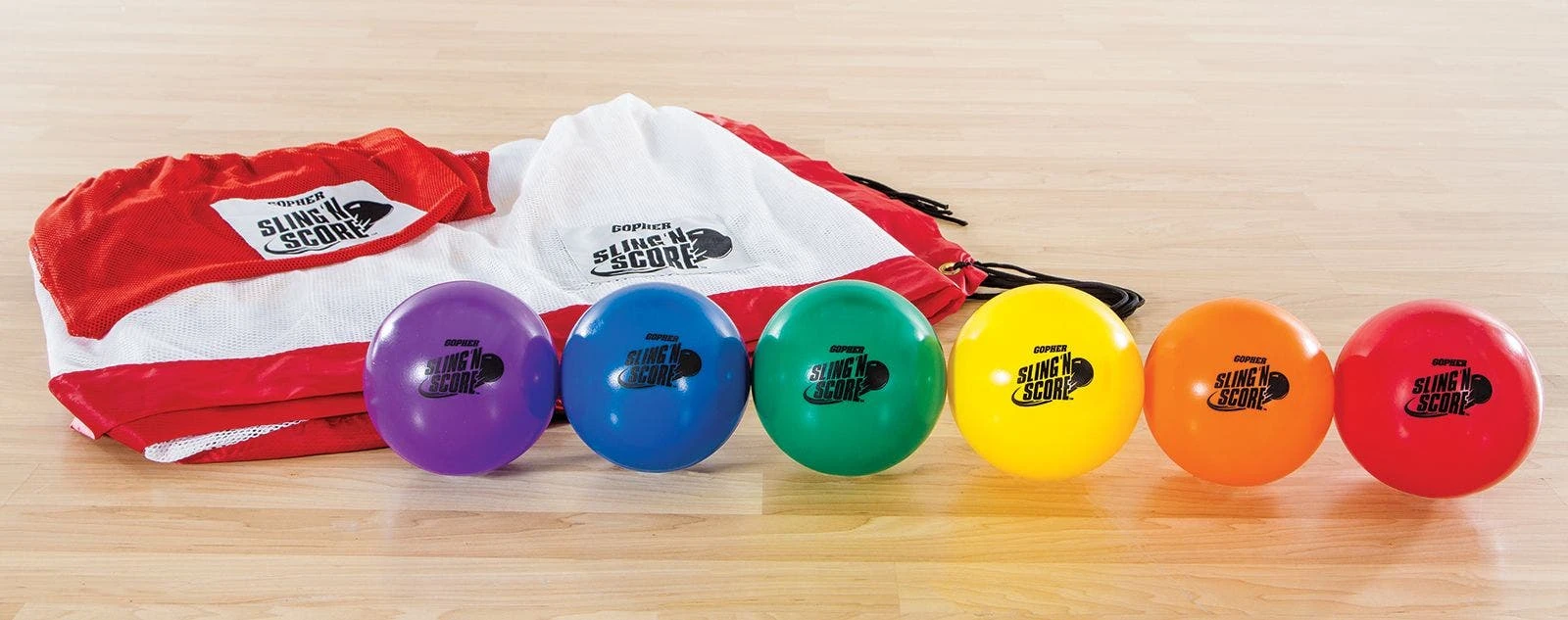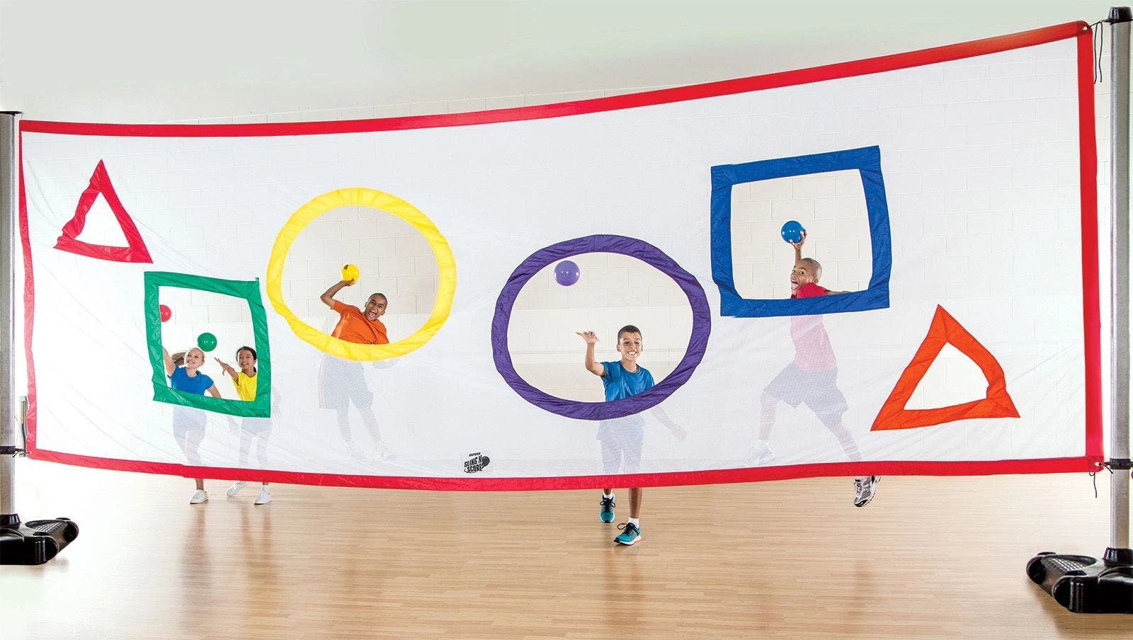 The oversized Sling ‘N Score Net has shapes cut out of it, including 2 triangles, 2 circles, and 2 squares. Each shape is outlined with a different Rainbow color. The net is made of a polyester mesh material that is weather resistant, meaning you can use it indoors or out for years to come at your school.