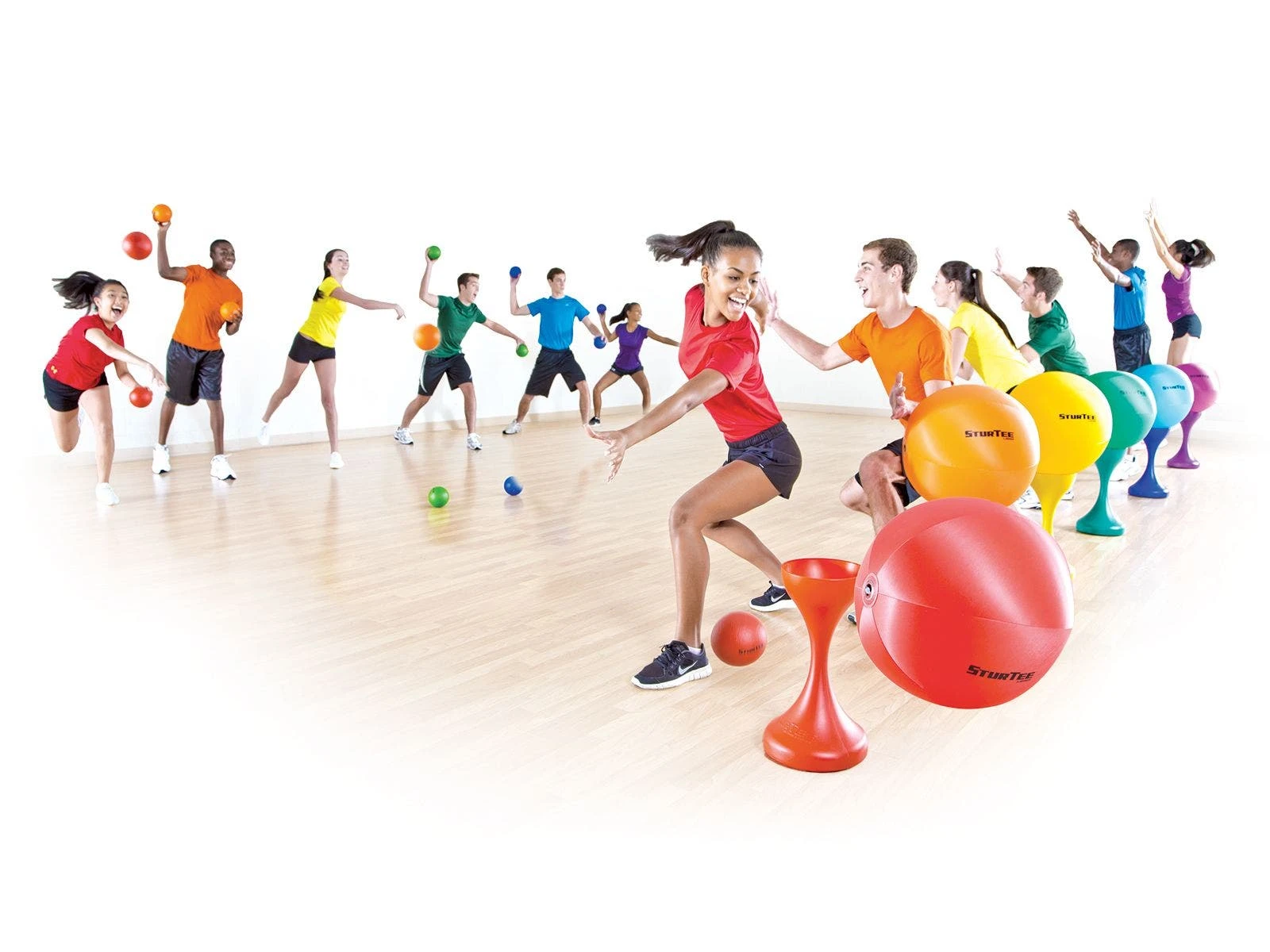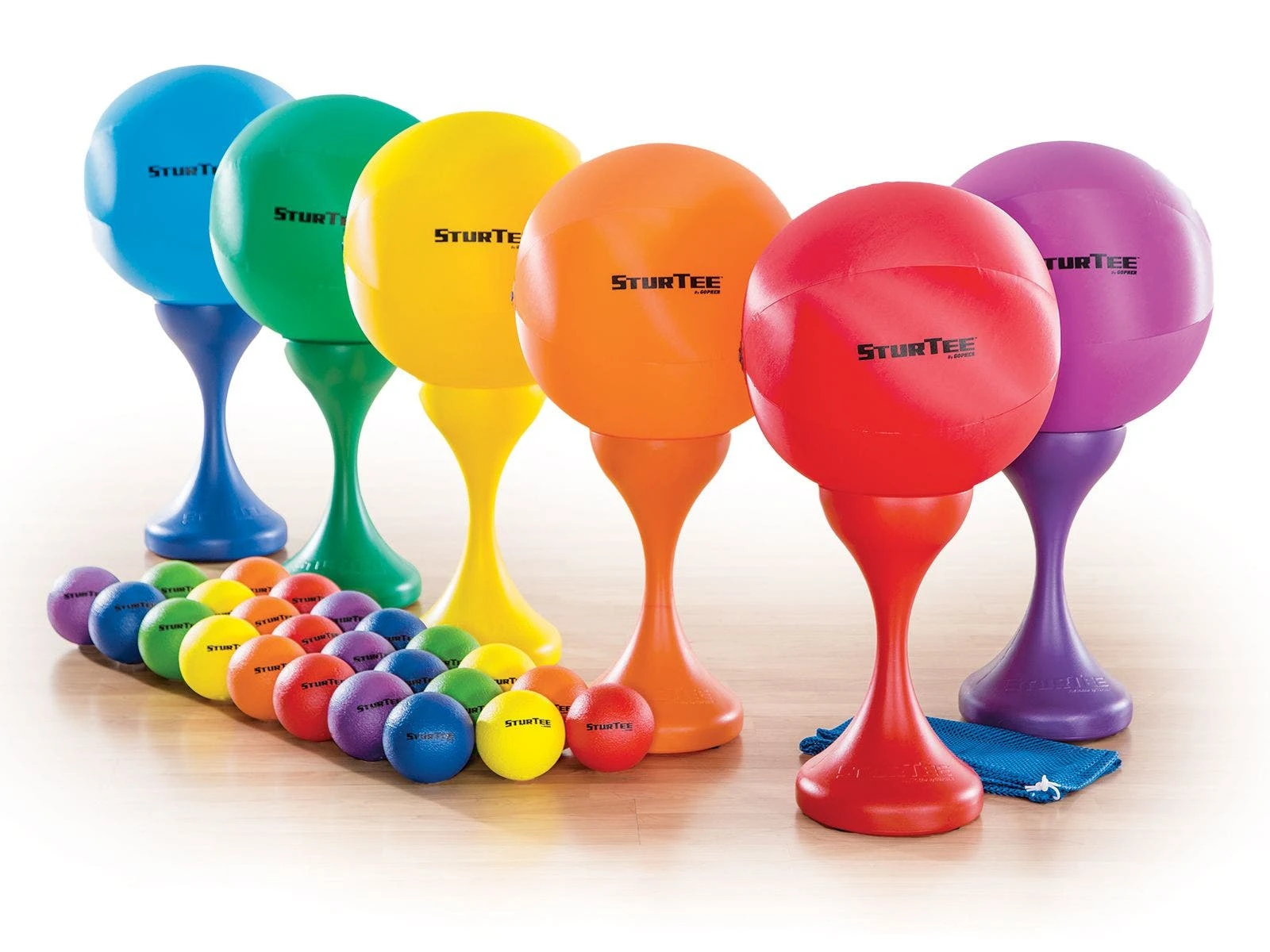 Set includes 6 Rainbow SturTee ball holders, 6 Rainbow SturTee Beach Balls (18″ dia), 24 foam balls, 1 VersaBag mesh storage bag, and activity instructions.