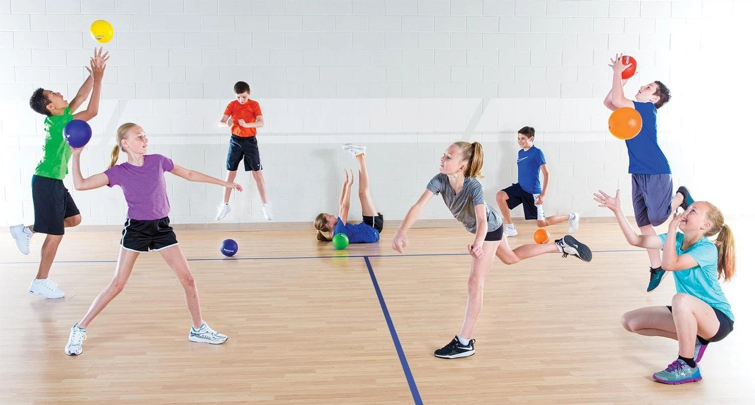 Incorporate fitness during a non-elimination fitness dodgeball game! The game begins when teams race from the back lines to retrieve a ball from the center line. If a ball hits a player, he/she runs to the sideline and performs the exercise indicated on the ball. Players re-enter the game after completing the exercise indicated on the ball. The team with the least re-entries at the end of the game wins!