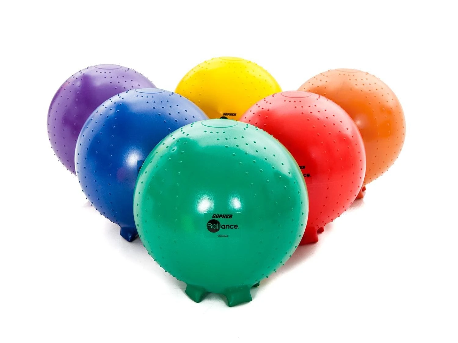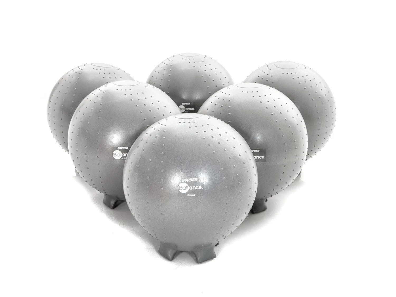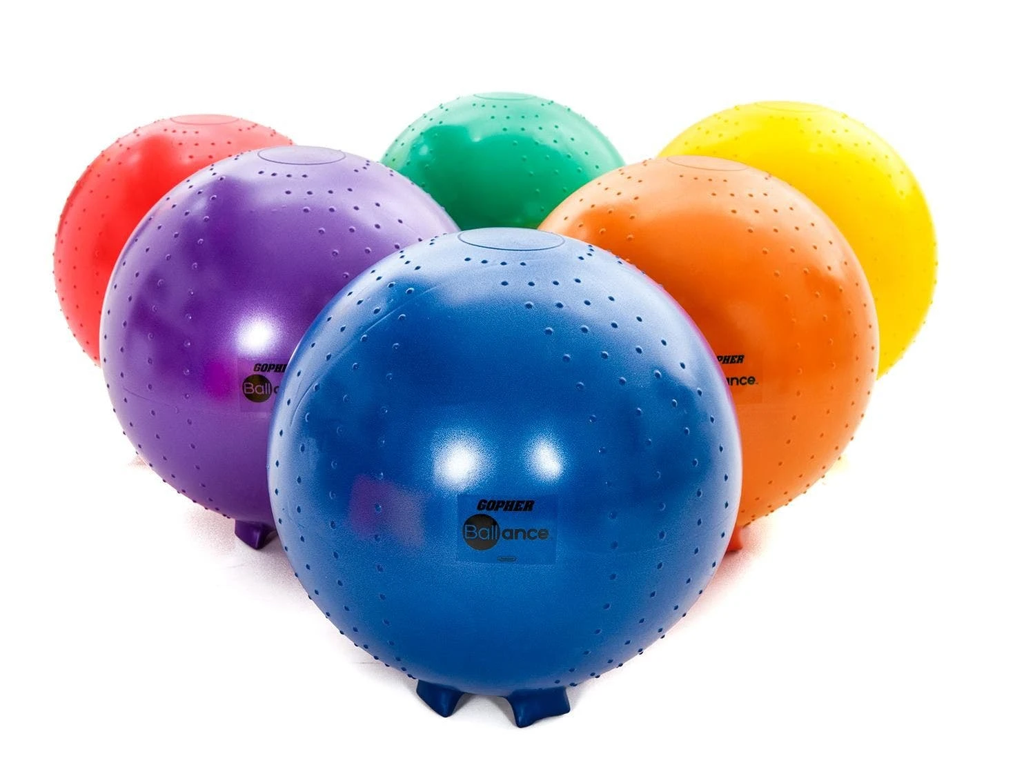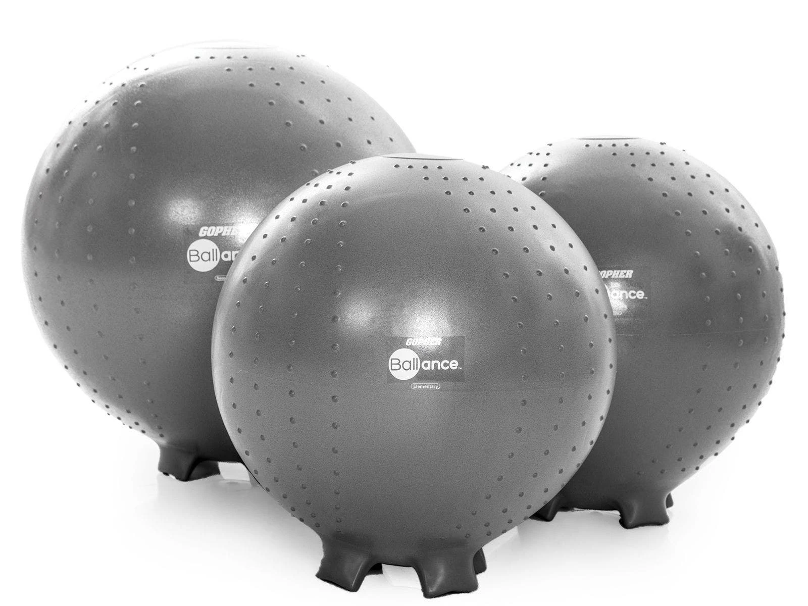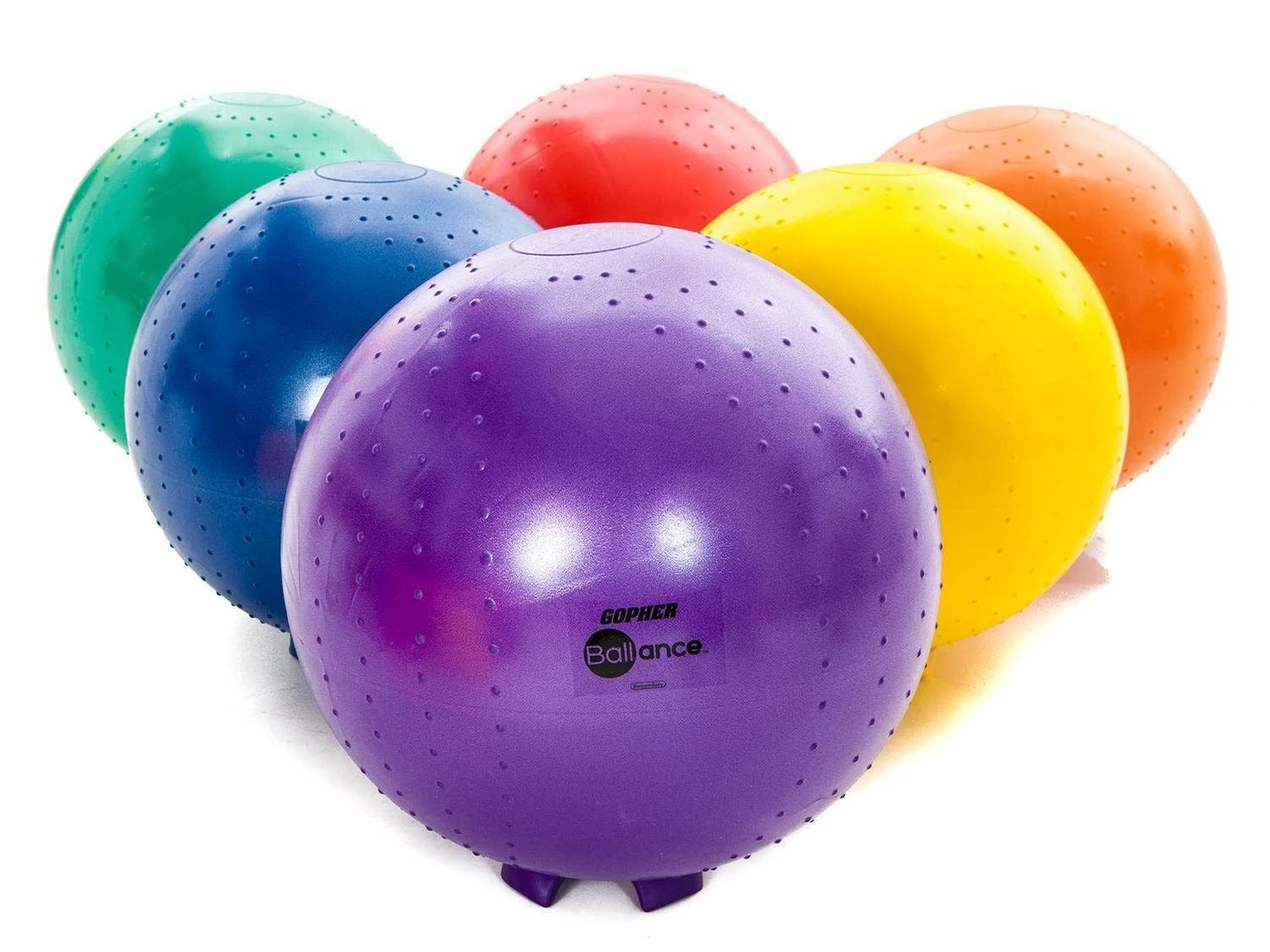 Molded-in feet keep stability balls in place when not in use and retract into the ball when students on them. Unstable design helps students improve their focus and core strength while sitting on them. The chair is made of a durable, burst-resistant material that accommodates up to 500 lb. A slight texture on the top provides traction.