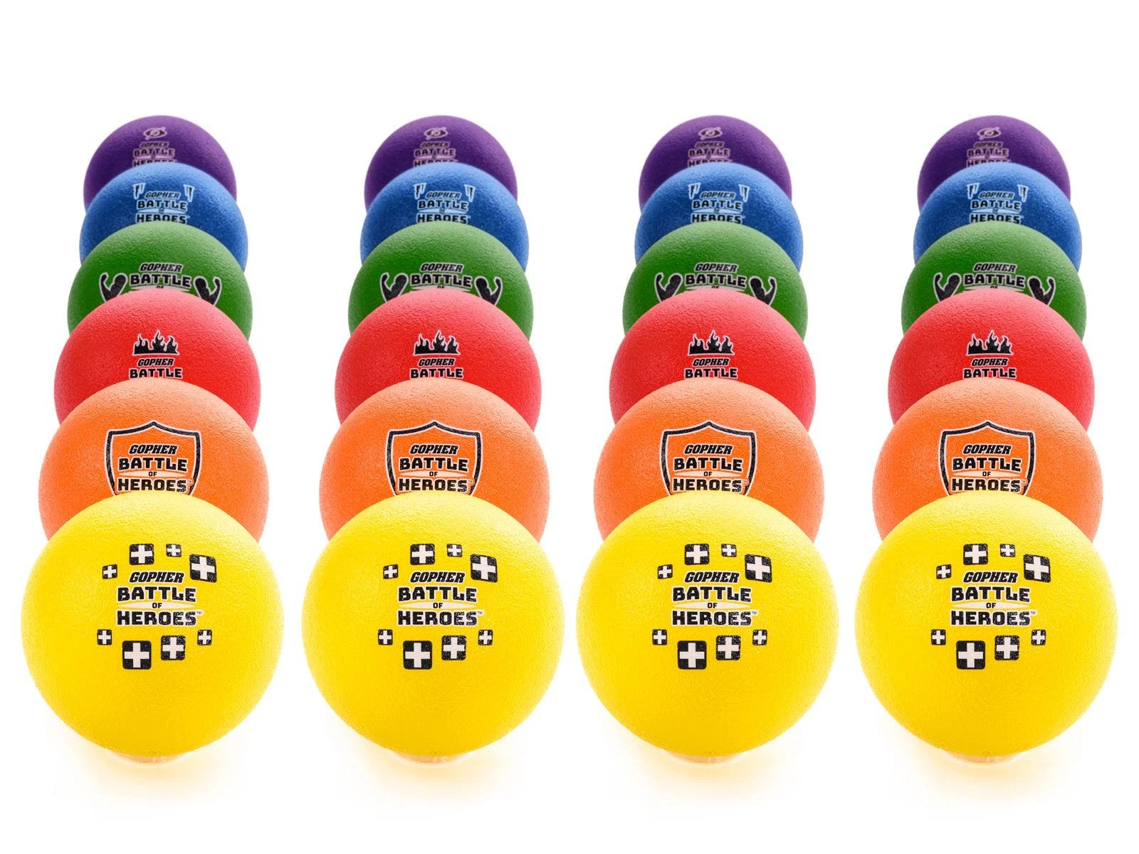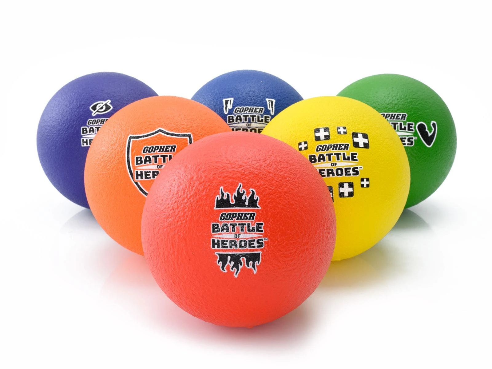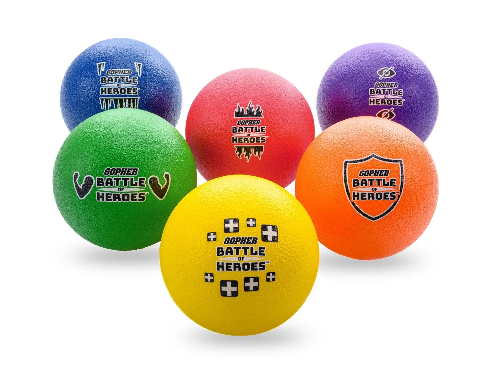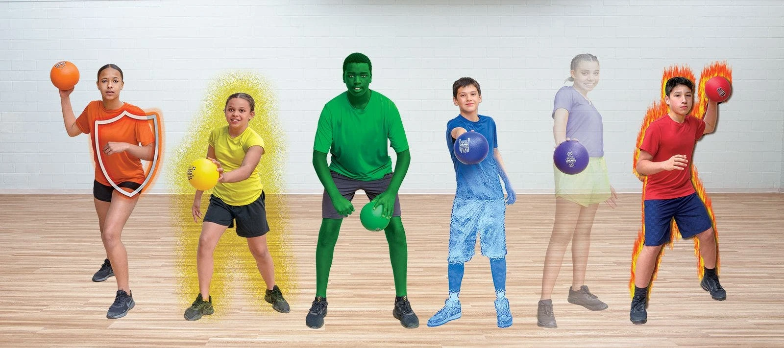 Let your inner superhero come out and play! Coated-foam dodgeballs with superhero powers add an extra level of fun and strategy to team games. Red gives players fire power, orange is a super shield, yellow heals, green is super strength, blue is ice to freeze villains, and purple is invisibility. Each ball features graphics to remind players of its ability. Teammates assemble to protect each other during superhero games, while also attempting to defeat the other team. For example, when a player is knocked out by the fire ball, a teammate needs to tag them with the ice ball to save them and bring them back into the game. The last team standing is the champion.