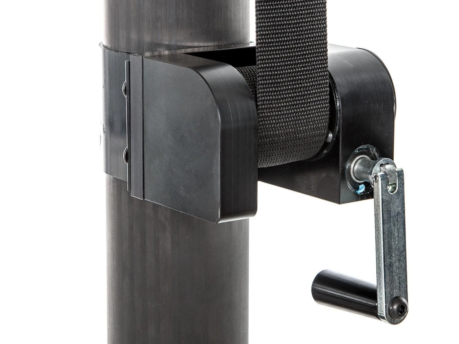 One-of-a-kind hybrid system has a 3-1/2″ dia upper post made of carbon fiber and a 3″ dia aluminum lower post. Quickly adjust the net height with an inner telescoping pole that uses an internal bevel gear, lead screw mechanism, and a non-removable winch handle. The inner telescoping pole includes an engraved net height indicator with markings for men’s, women’s, and youth leagues.