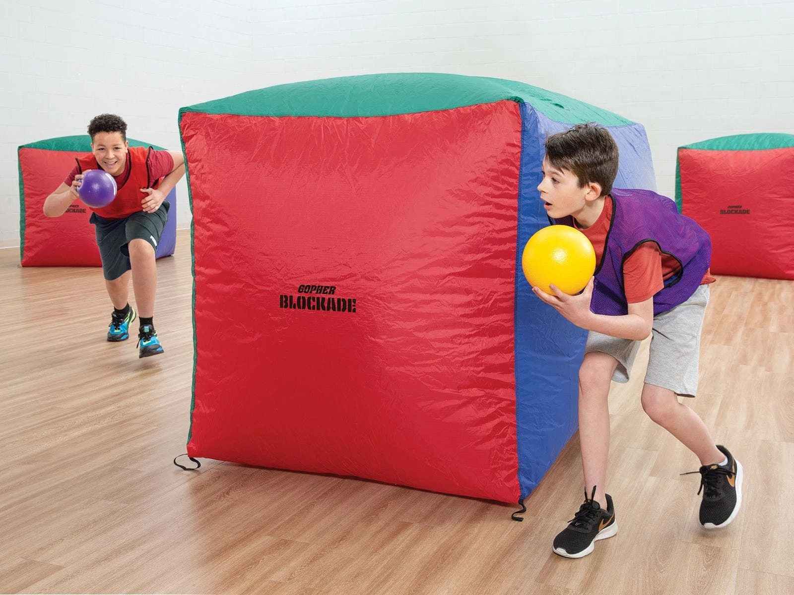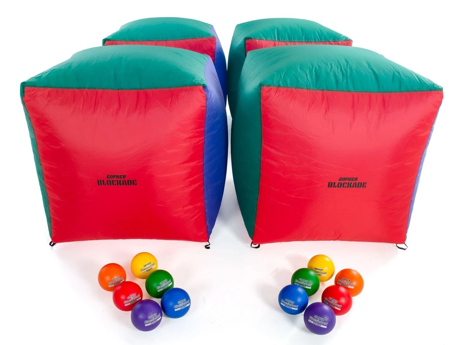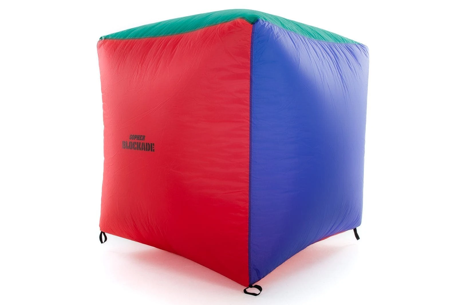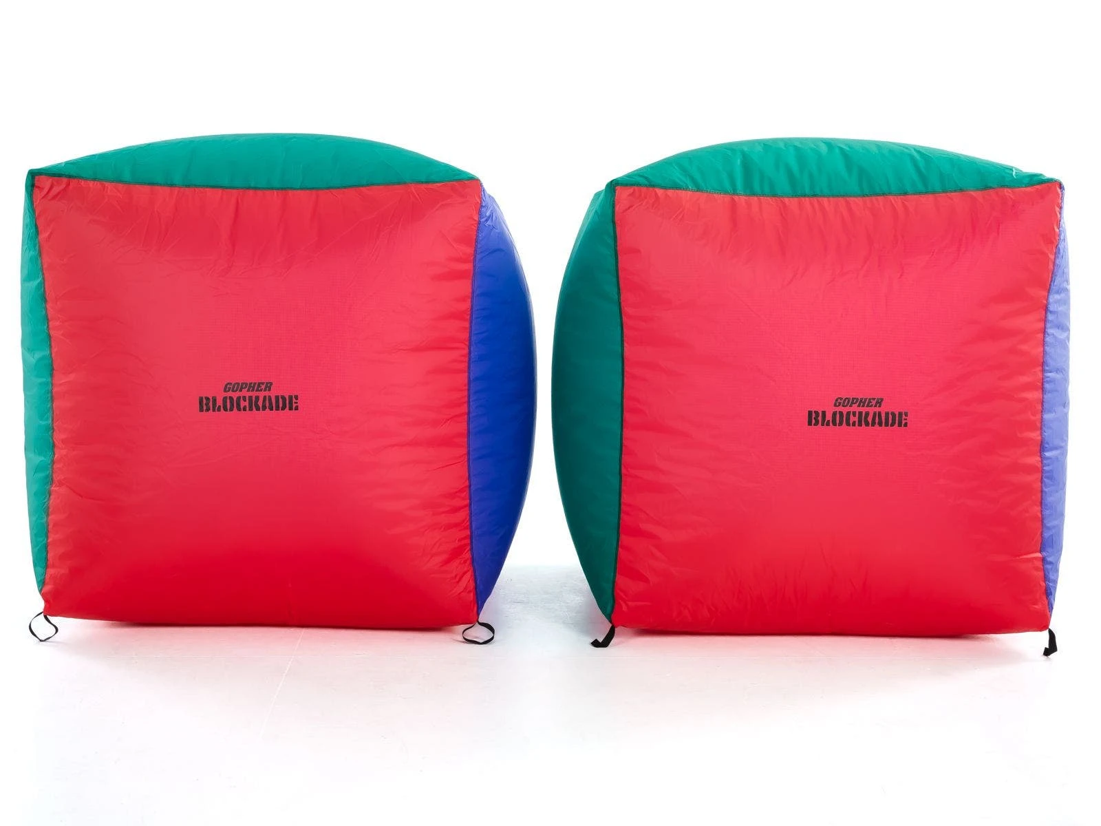 Each barrier is 47-1/4”L x 47-1/4”W x 47-1/4”H with a 5 lb weight sewn into the bottom to keep the cube in place during gameplay. Barriers also include loops in each corner to keep them in place outdoors when using your own stakes. Barriers are designed for use with lightweight balls and not for climbing. Available individually, as a pair, or in Complete Sets with 4 barriers, 12 coated-foam dodgeballs (your choice of DuraCoat or ClassicCoat), and a VersaBag mesh storage bag.