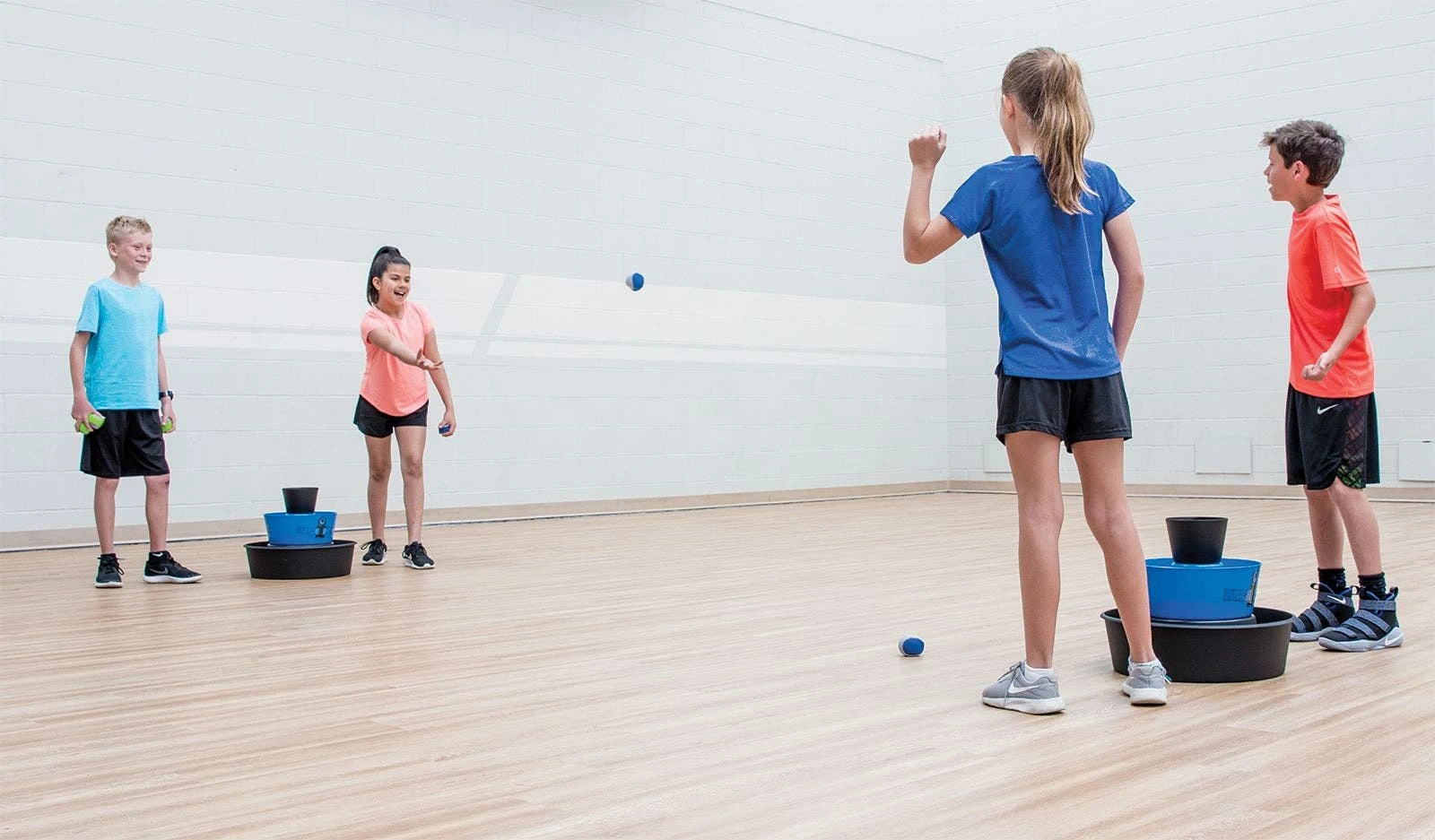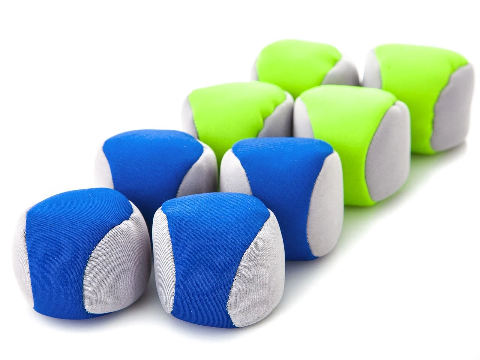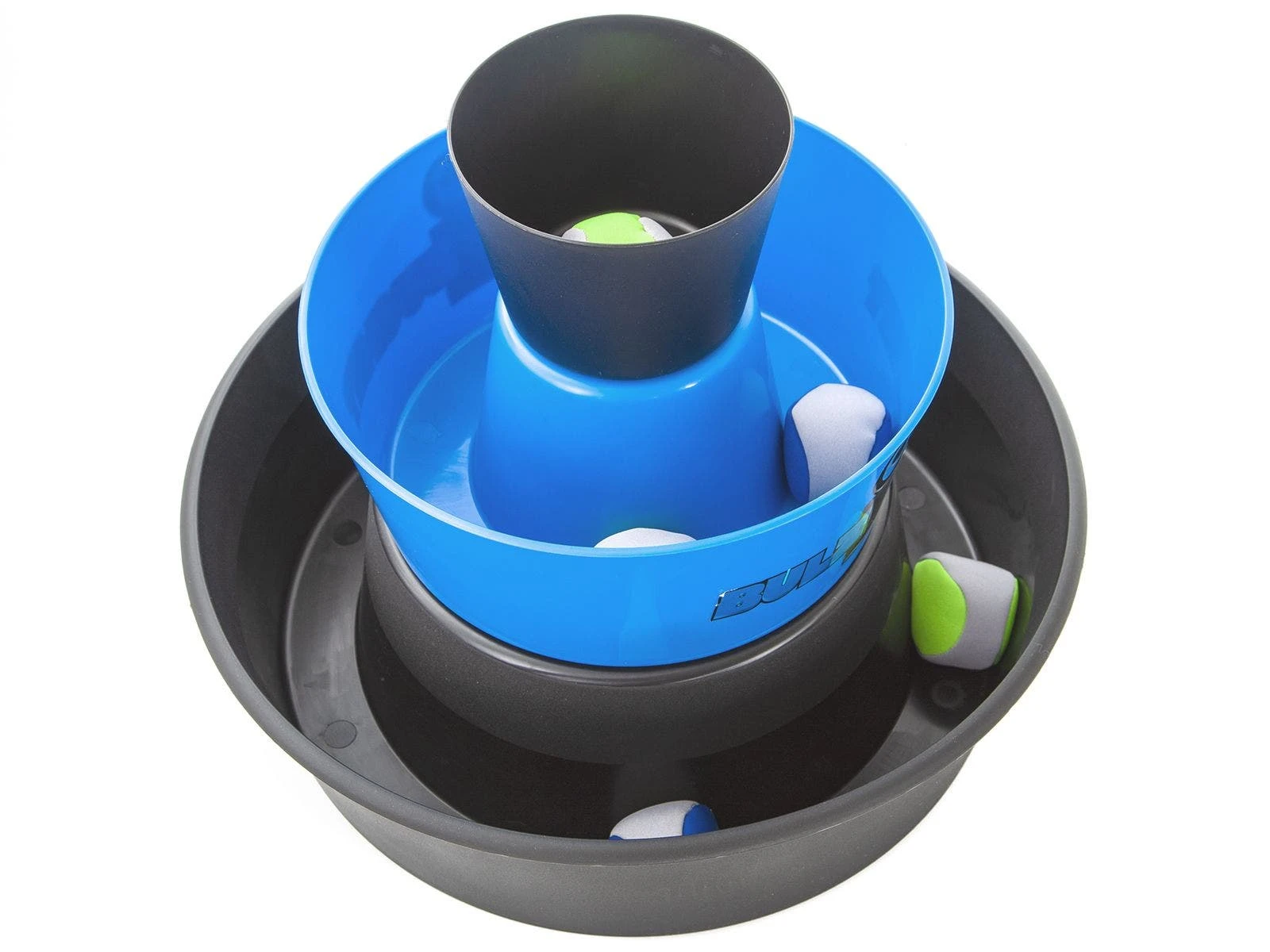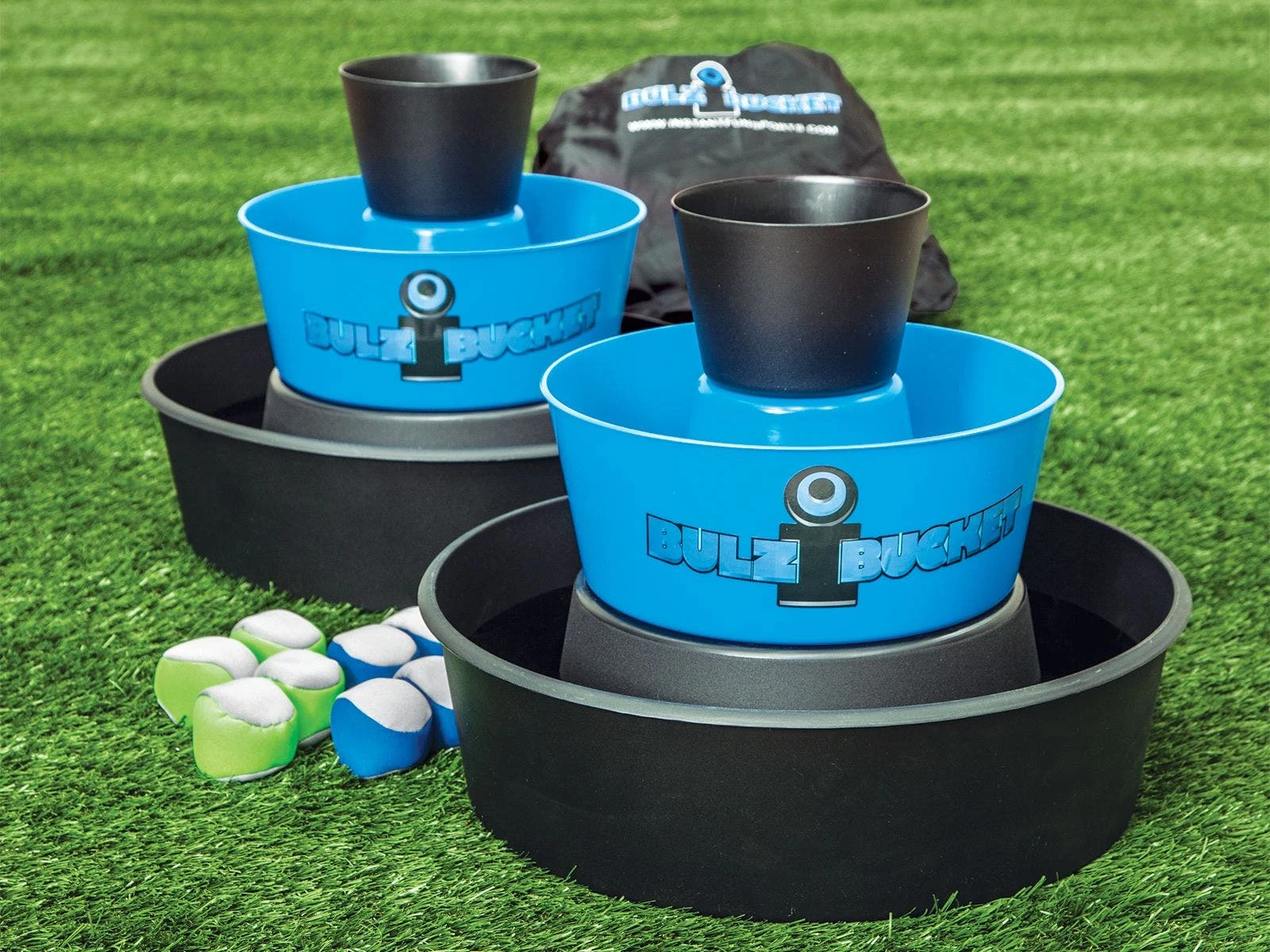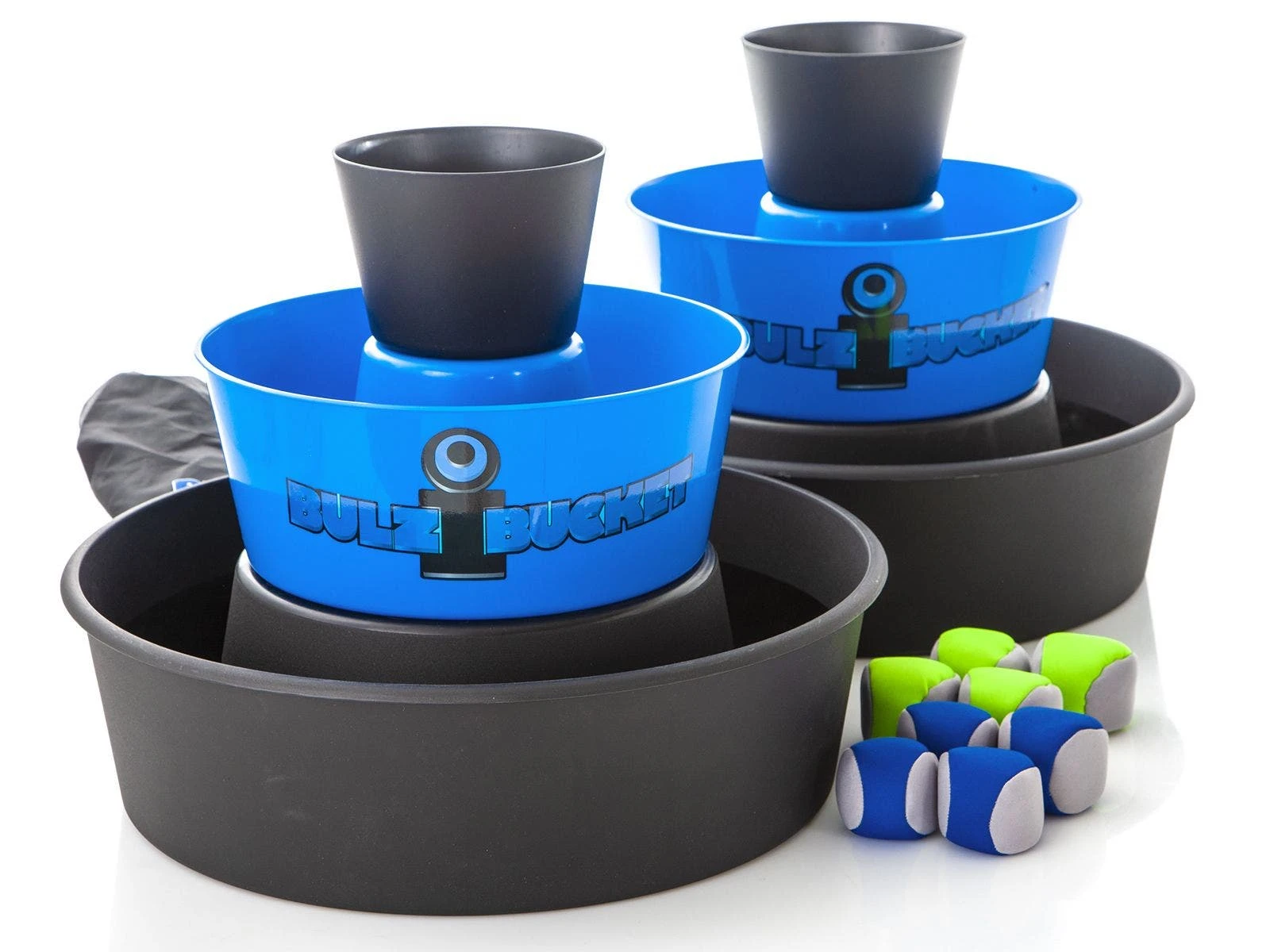 Set includes 2 collapsible buckets (19″H x 19″ dia), 6 beanbag footbags, and a storage bag.