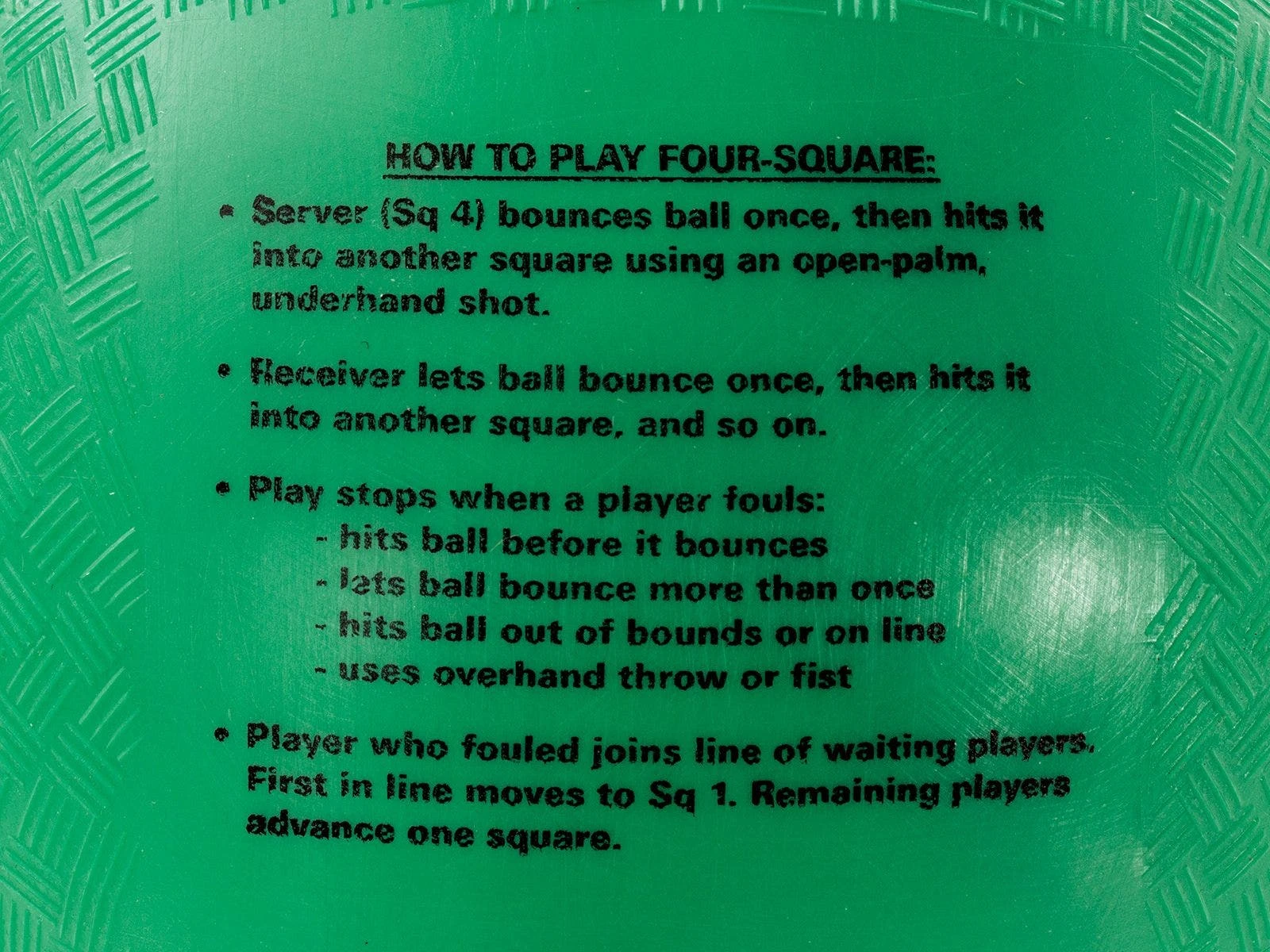 Step into the square with a friendlier ball that lasts for years. Featuring a soft, one-piece design, this ball offers a more inviting experience for all ages, while its stippled surface increases grip and control. The 2.5 mm thick rotomolded liquid vinyl construction holds up better than rubber playground balls for long-lasting play on the gym floor or out on the courts. Plus, it wonβt harden or crack over time. The rules of 4-Square are printed right on the ball so games never slow down. 8.5β dia. Available in a Set of 6