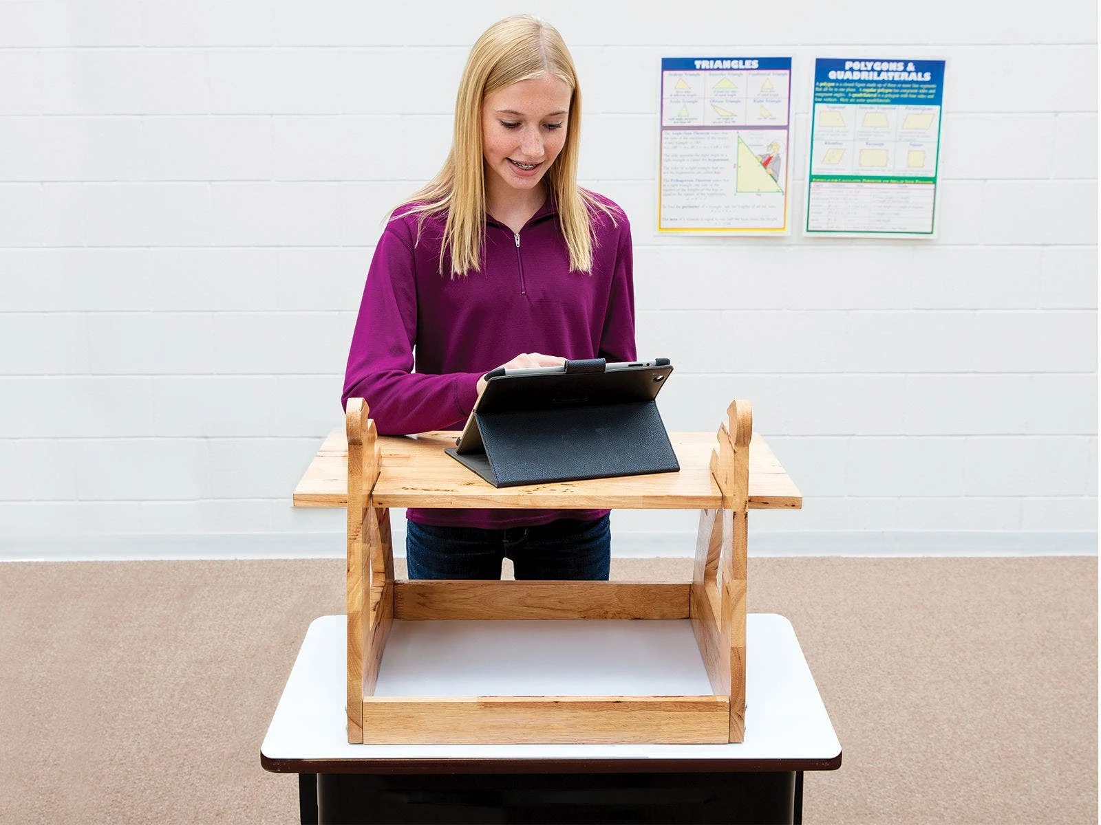 This adjustable tabletop standing desk turns your existing desks into standing desks in seconds. Simply slide the desk surface from its slot in the frame to another slot at the desired height to quickly adjust it from 8″ to 14″H in 2″ increments. Easy adjustments mean there is no need to haul out different equipment for new users between classes.