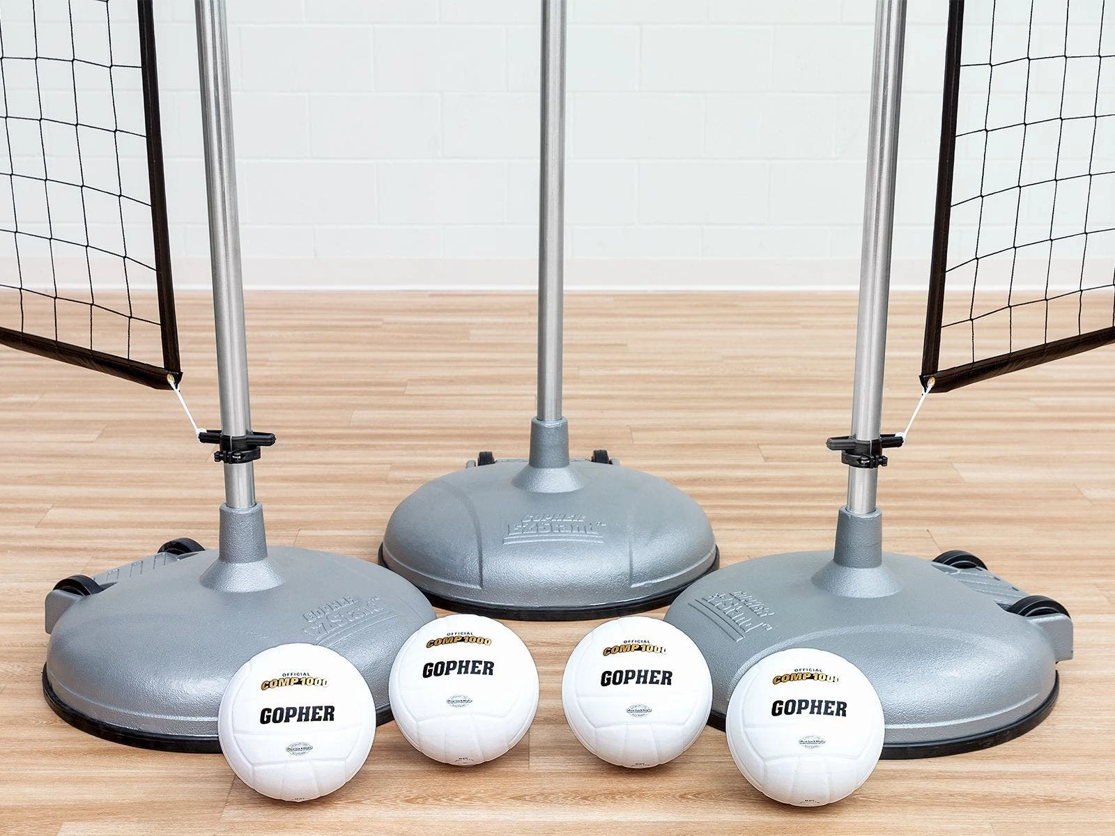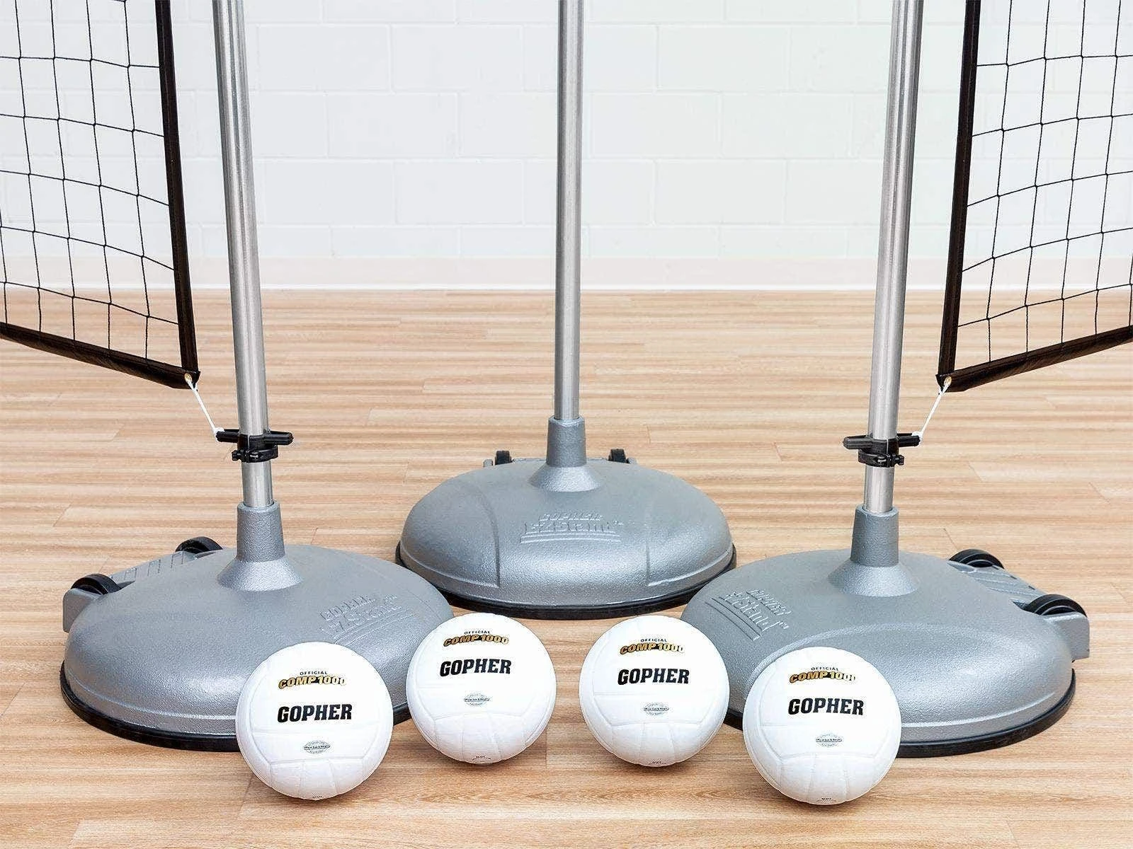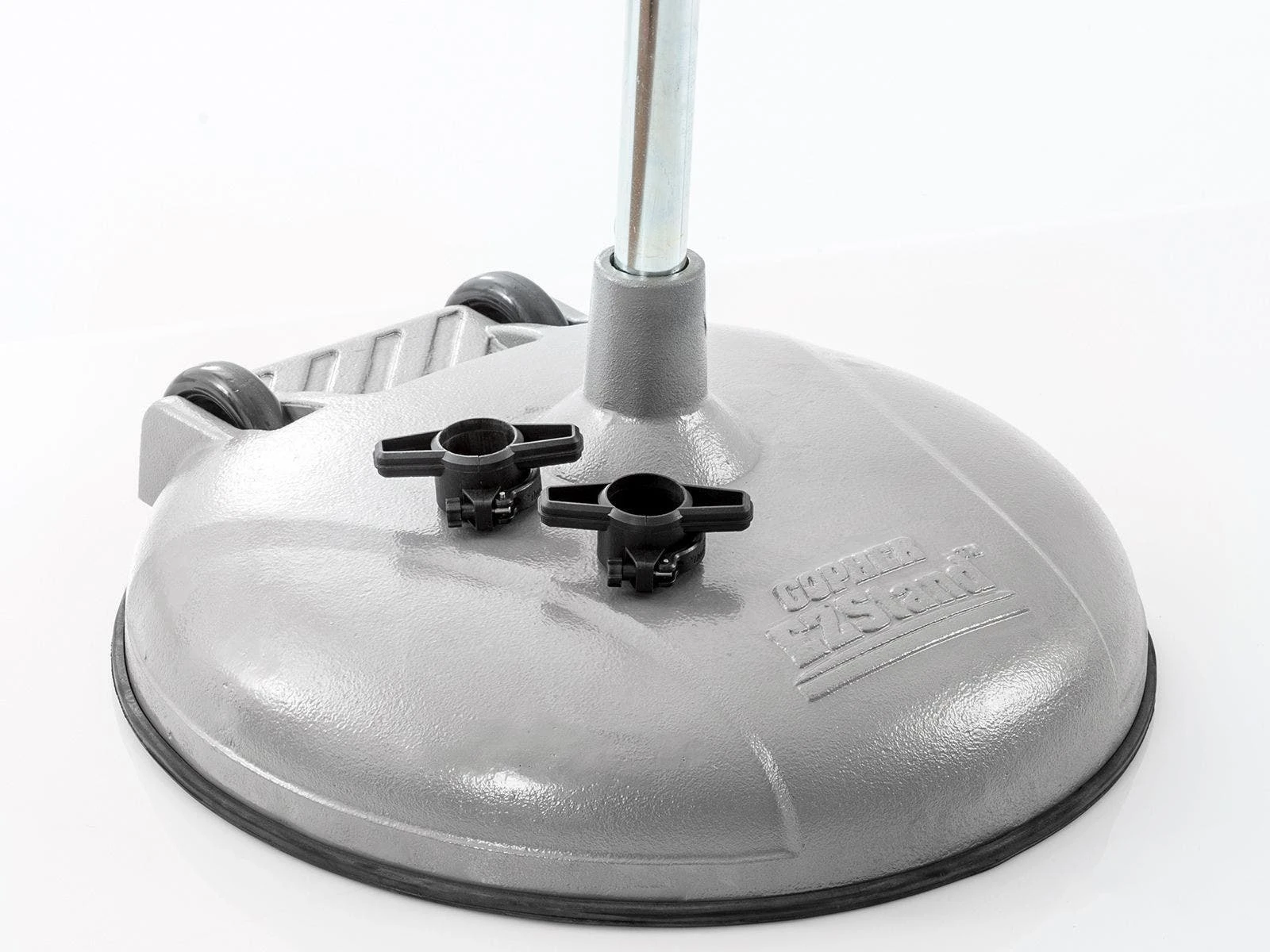 Portable volleyball standards with a heavy-duty cast iron base keep uprights standing straight for years to come. They come with an upgraded support sleeve and are bolted under the standard to lock the upright in place.