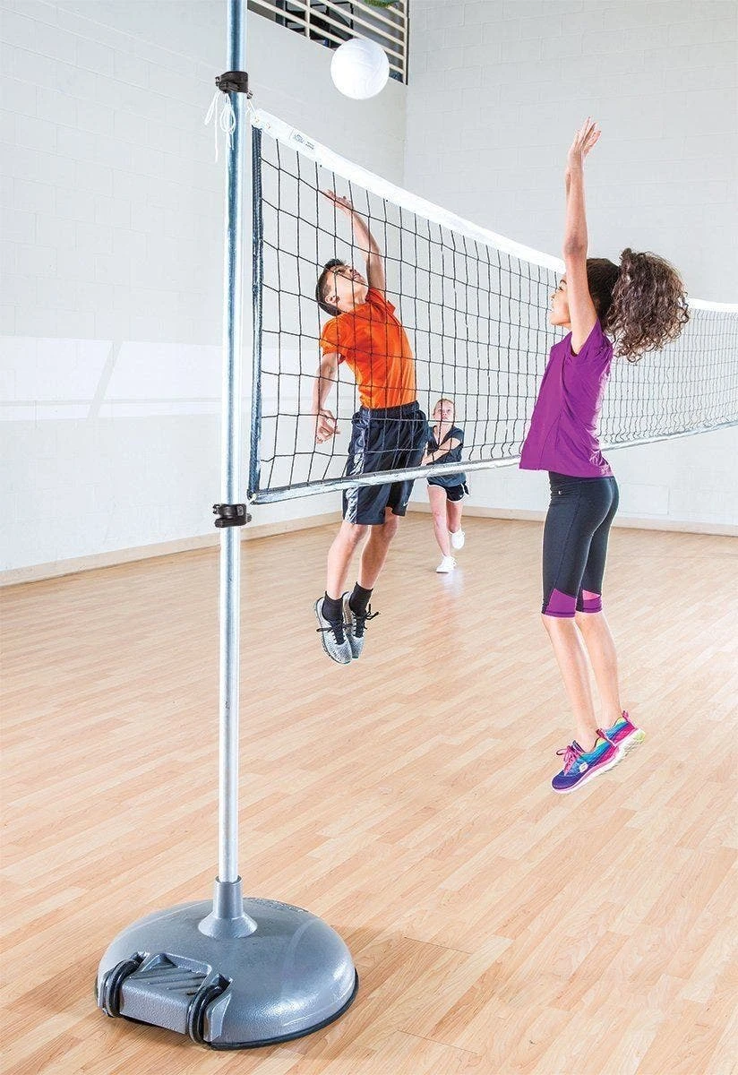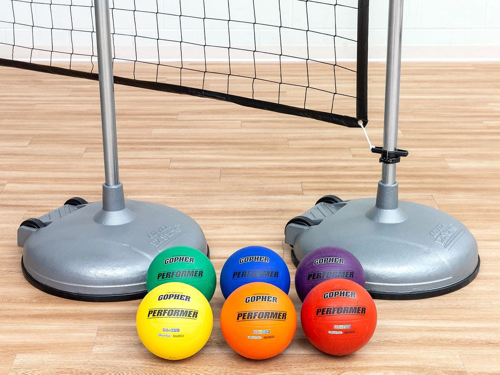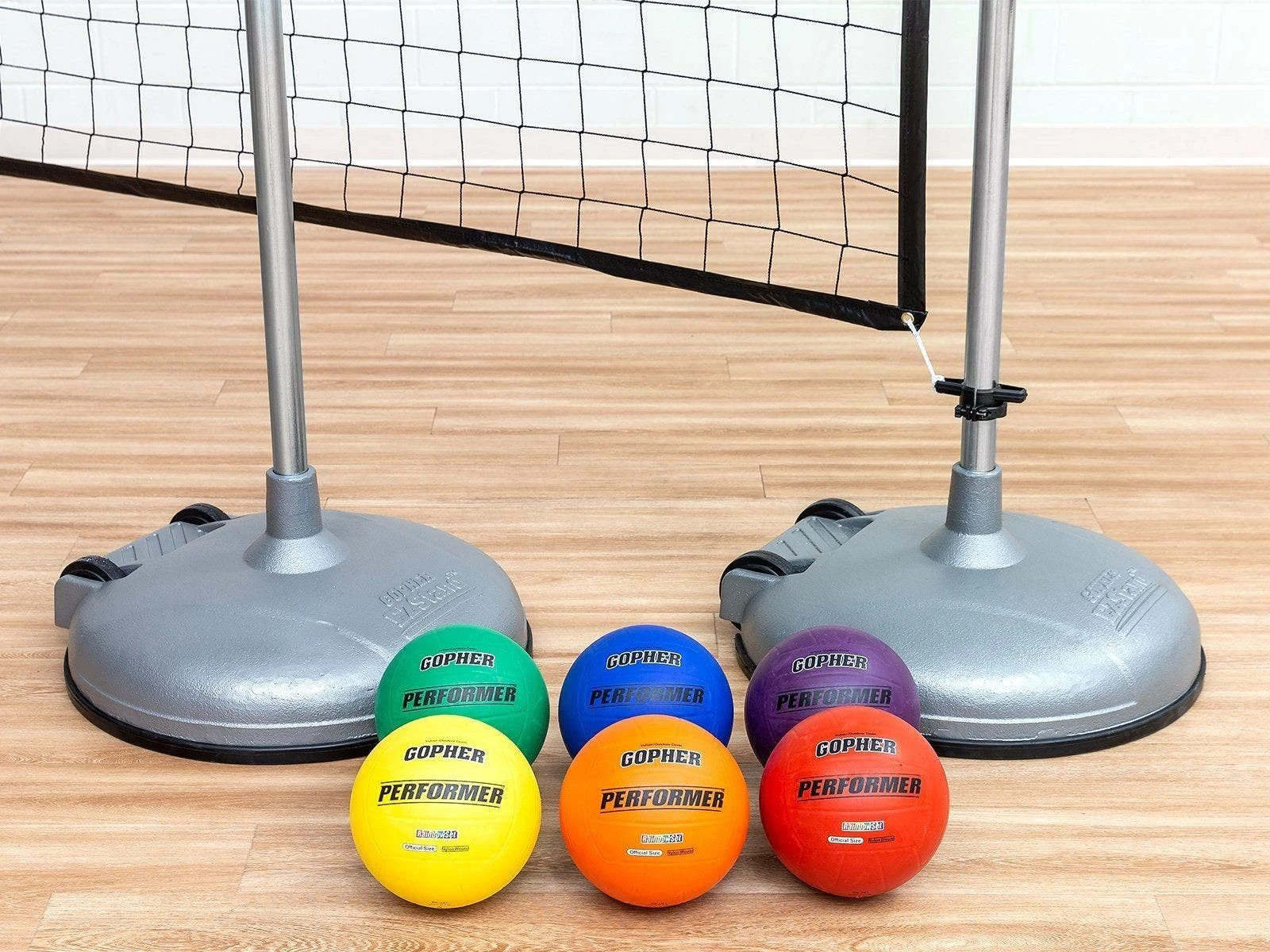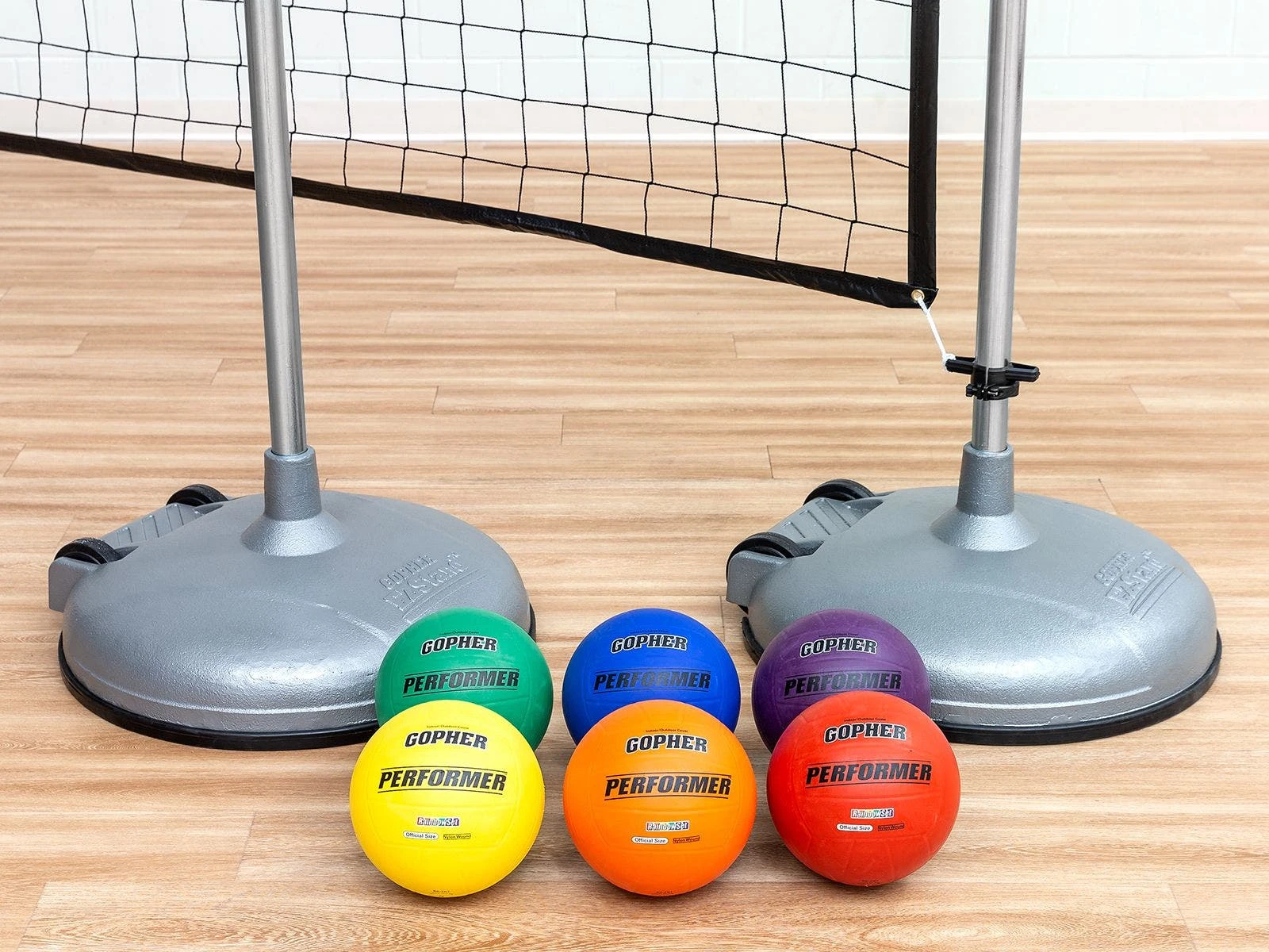 Portable volleyball standards with a heavy-duty cast iron base keep uprights standing straight for years to come. They come with an upgraded support sleeve and are bolted under the standard to lock the upright in place.