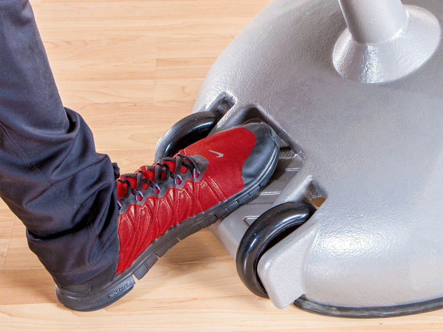 The pole bolts under the base, instead of on the top, allowing for increased stability. An extended stem on the top of this base adds to the stability. Cast iron design adds more weight and makes the bases extremely durable, allowing them to withstand daily institutional use. Several weight options allow you to choose the standard that best fits your needs. A rubber rim is bolted onto the bases and protects floors from scratches and scrapes.