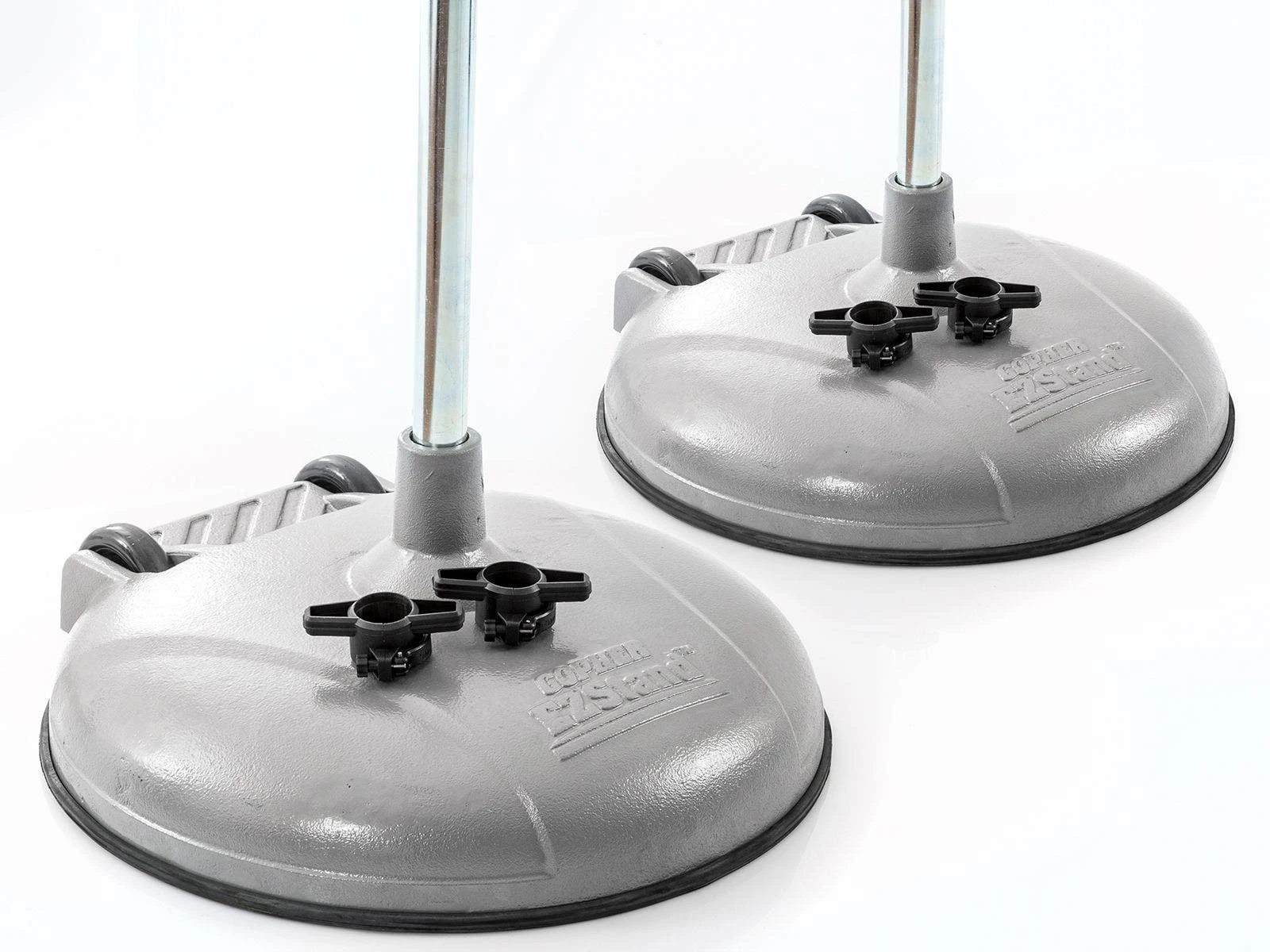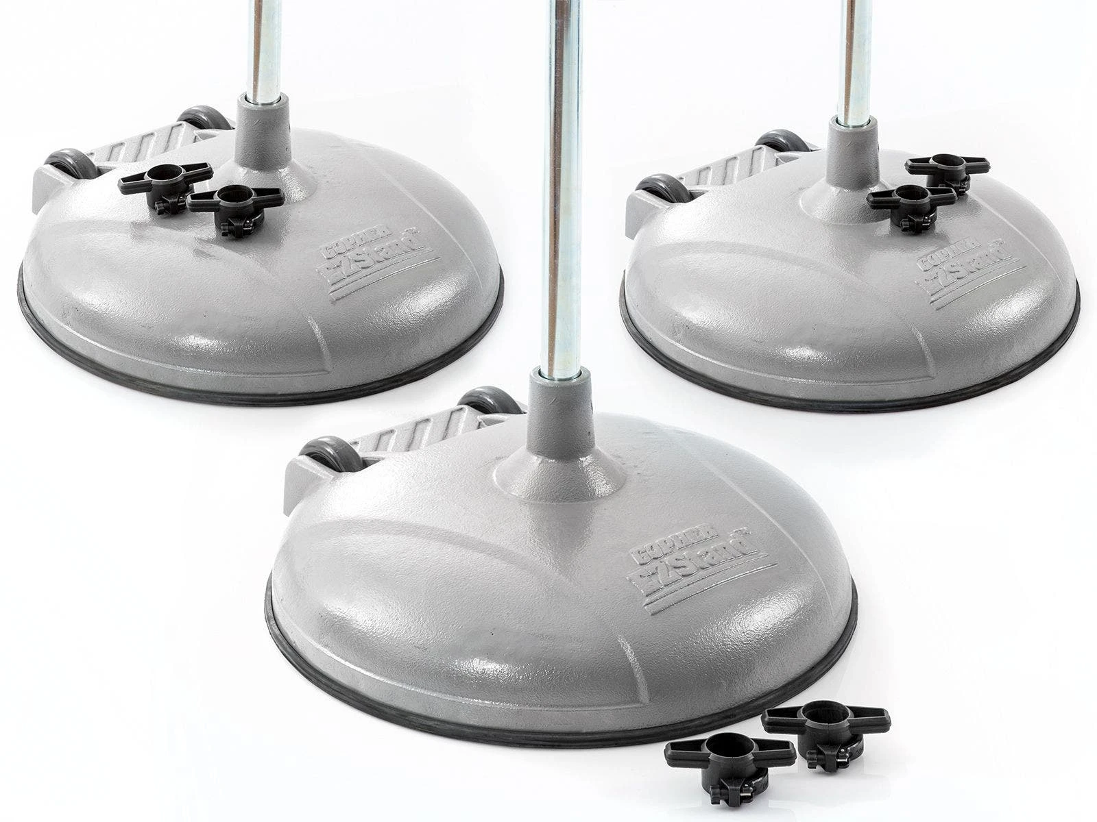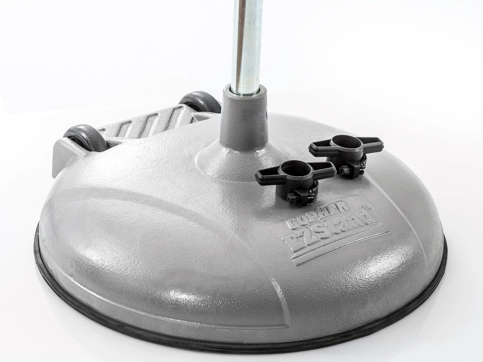 The pole bolts under the base, instead of on the top, allowing for increased stability. An extended stem on the top of this base adds to the stability. Cast iron design adds more weight and makes the bases extremely durable. Several weight options allow you to choose the standard that best fits your needs. A rubber rim is bolted onto the bases and protects floors from scratches and scrapes.