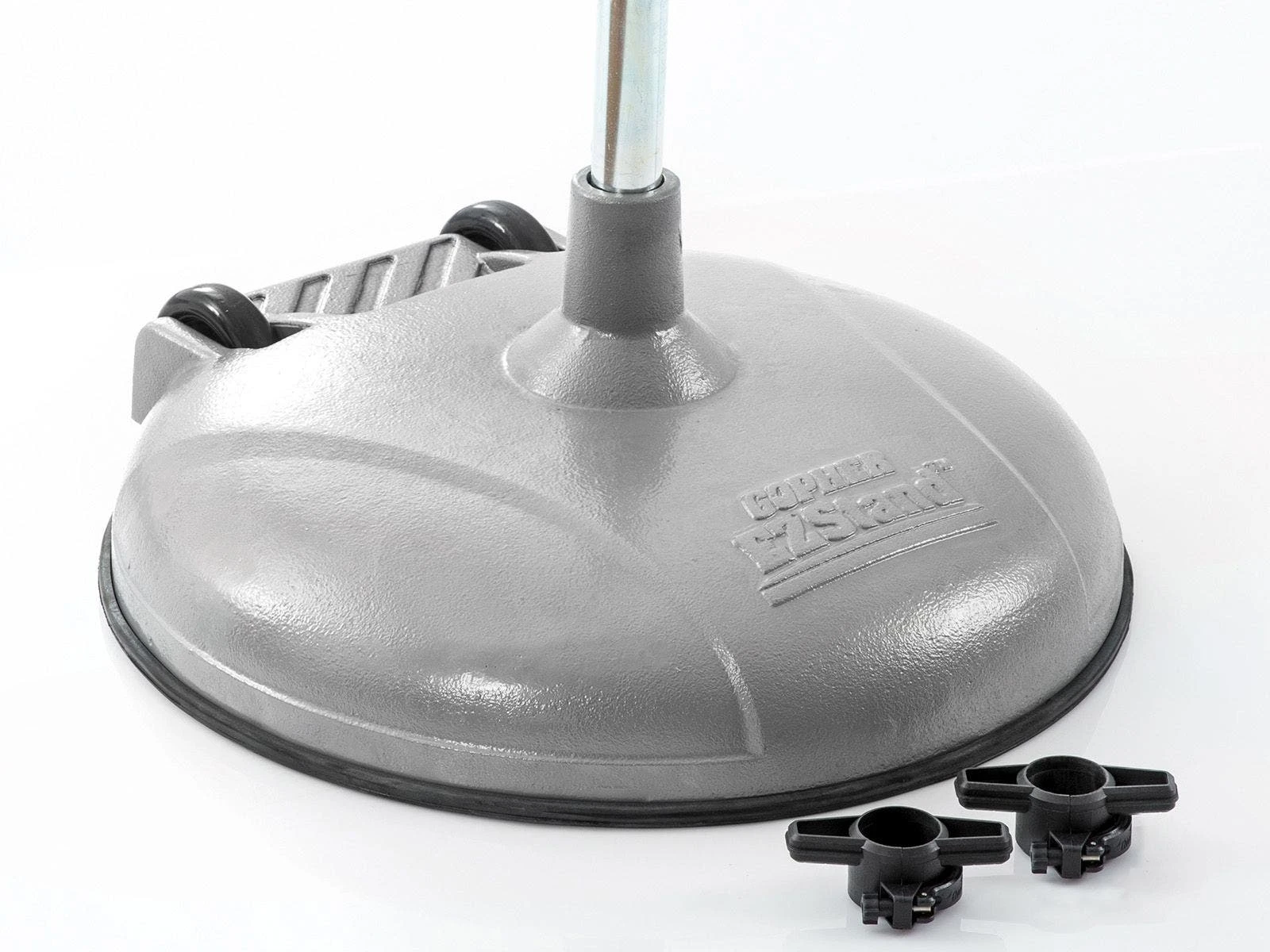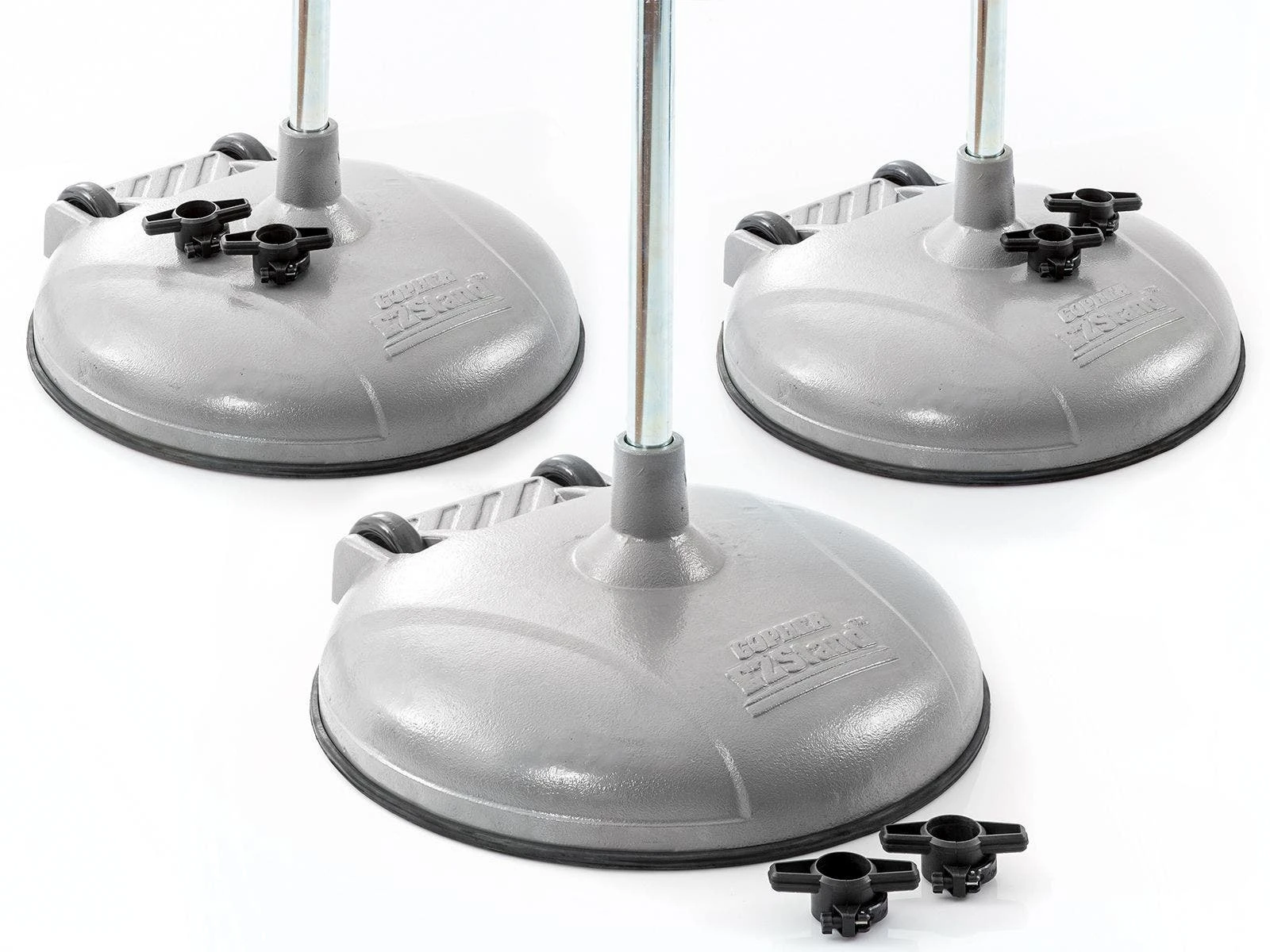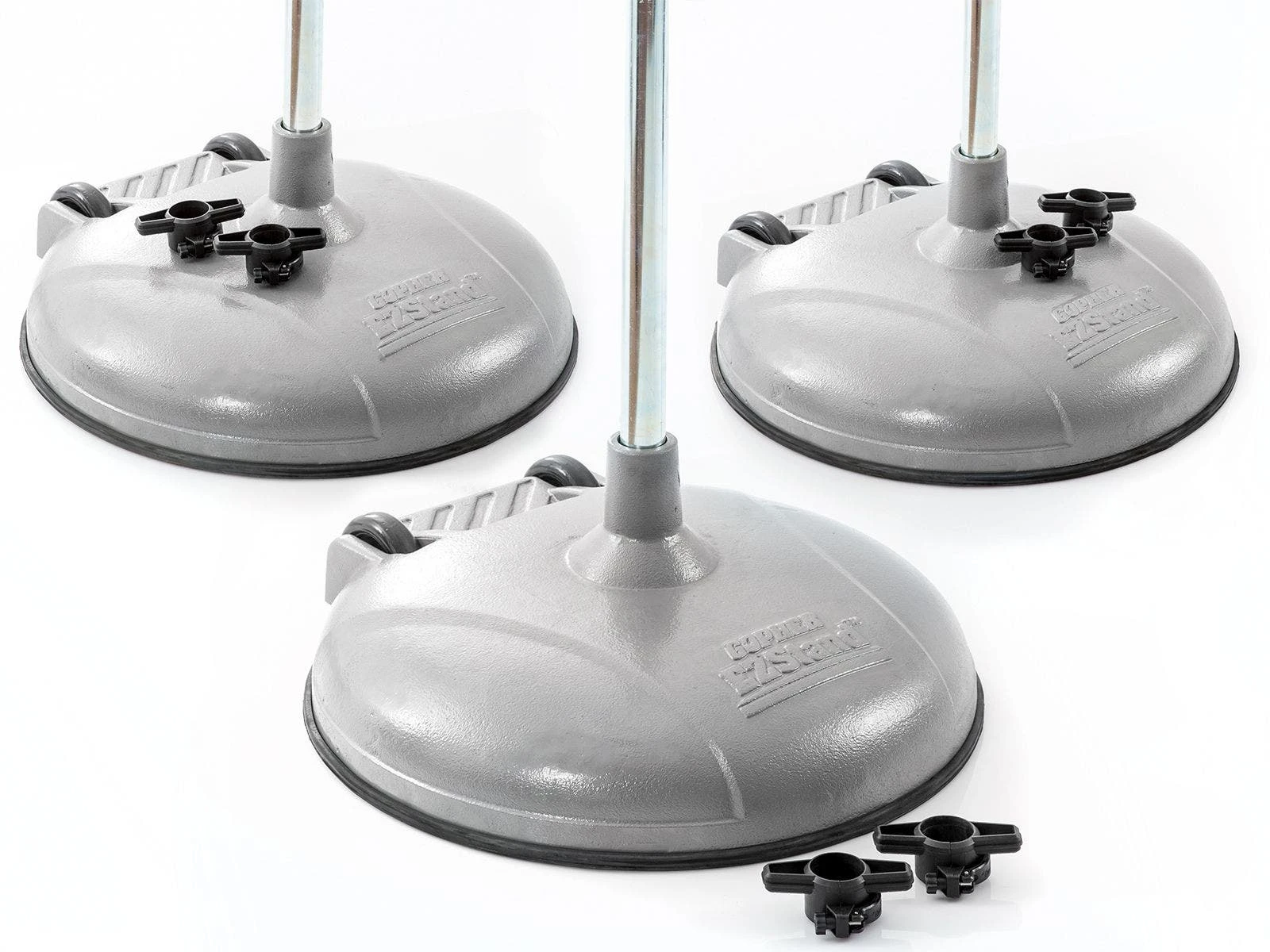 The pole bolts under the base, instead of on the top, allowing for increased stability. An extended stem on the top of this base adds to the stability. Cast iron design adds more weight and makes the bases extremely durable. Several weight options allow you to choose the standard that best fits your needs. A rubber rim is bolted onto the bases and protects floors from scratches and scrapes.