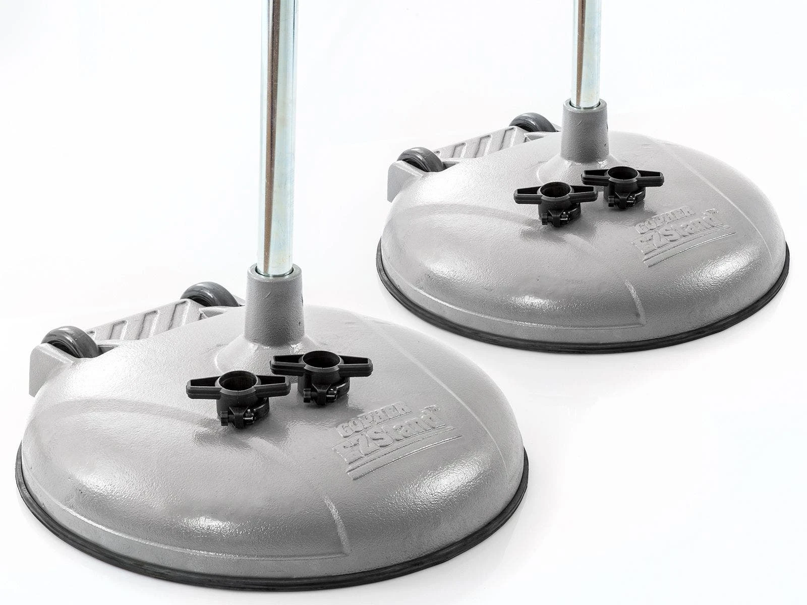 Silver, 24″ dia bases easily tip and roll on two 5” dia non-marring wheels. Simply place your foot on the included foot placement indicators and push back to roll the standards. Uprights are 10’H x 1-3/4″ dia