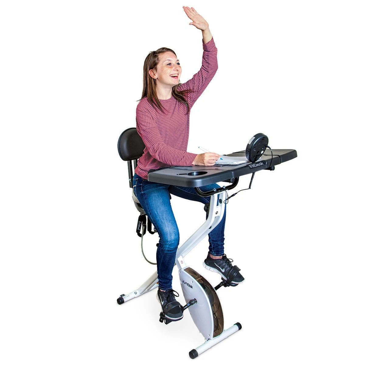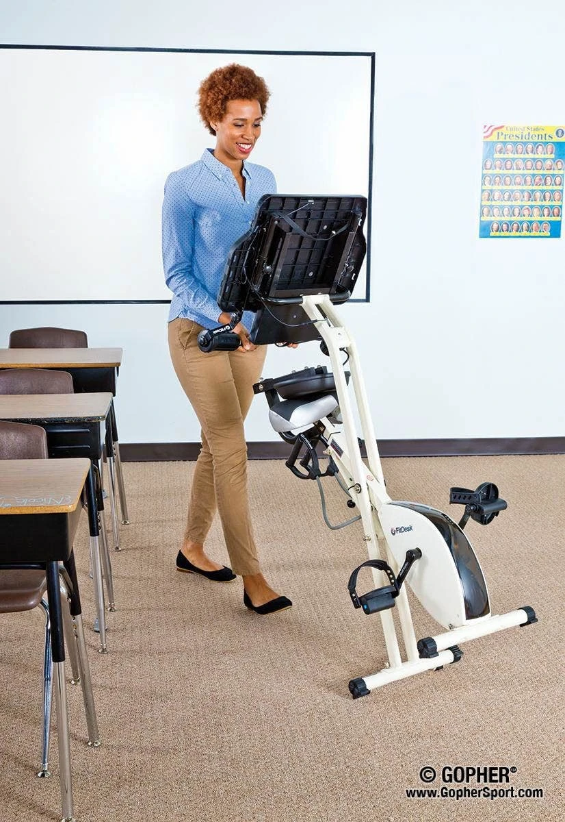 This lightweight, folding exercise bike/work station provides a comfortable ride and helps combat long periods of inactivity from sitting. It features a quiet, twin-belt flywheel that’s great for use in classrooms or other shared spaces.