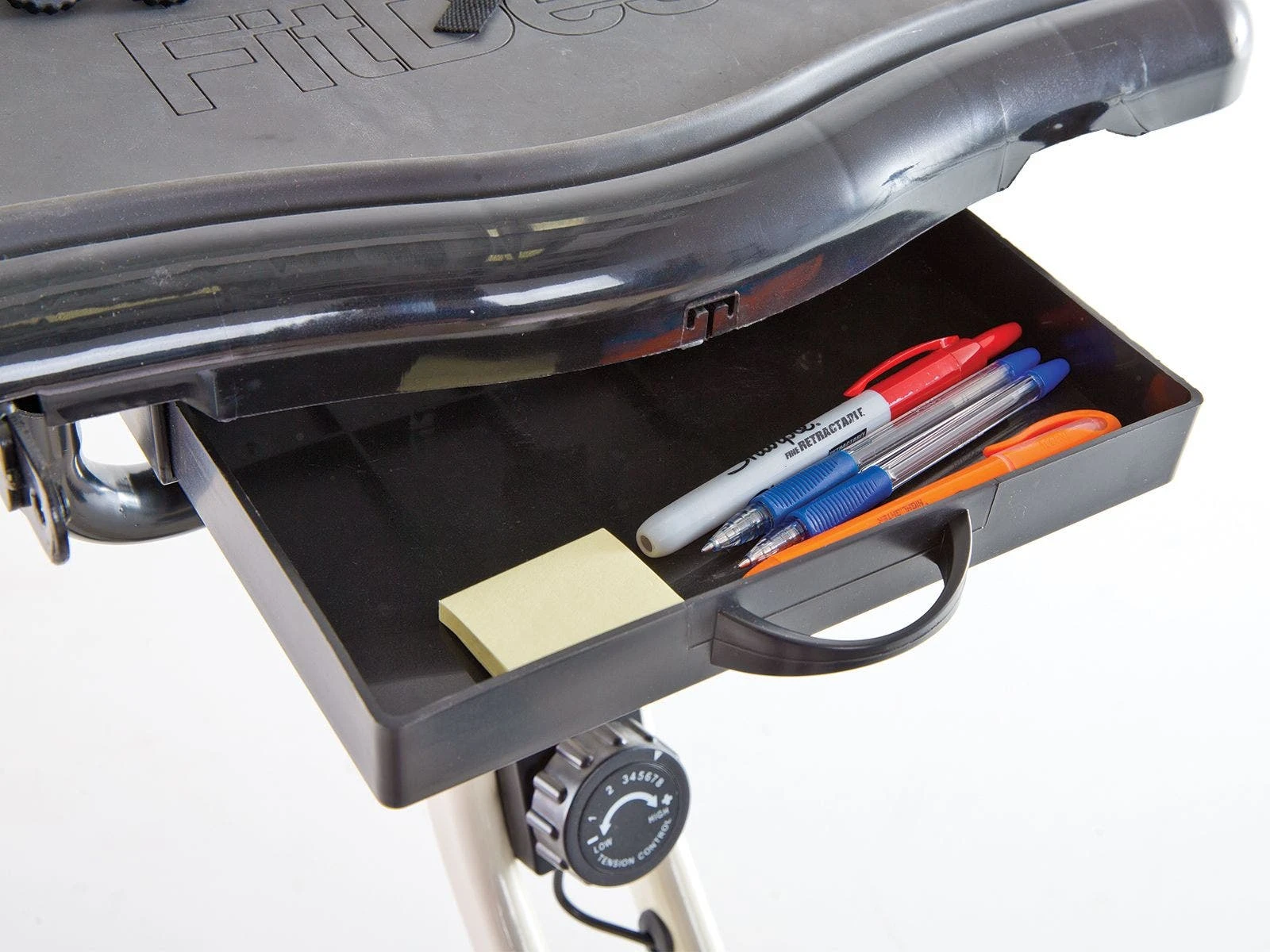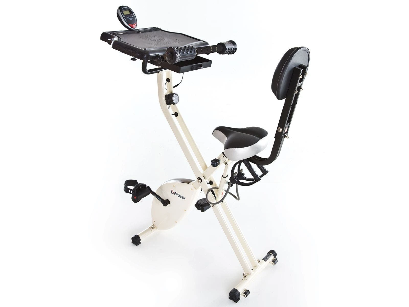 A 16” x 19” non-slide desk surface with massage rollers makes working easy and comfortable! Desk also features a built in tablet holder. Extension Kit (sold separately) doubles the work space area. Twin-belt flywheel is extremely quiet. When not in use, fold the desk and roll it into storage.