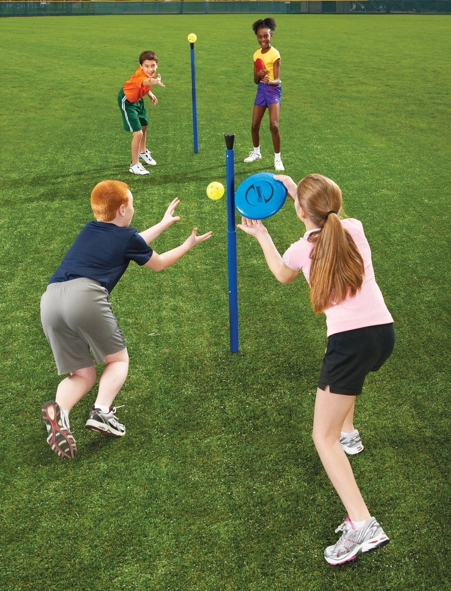 To start, place poles with a desired distance between them. Set a ball on each concave pole topper. Play with two teams of two players, with a member of each team standing by pole. One teammate throws the disc at the opposing pole, trying to knock the ball off to earn a point. At the same time, the defensive player attempts to catch the disc to earn a point. If the player drops the disc, the throwing team earns a point.