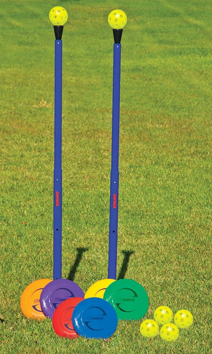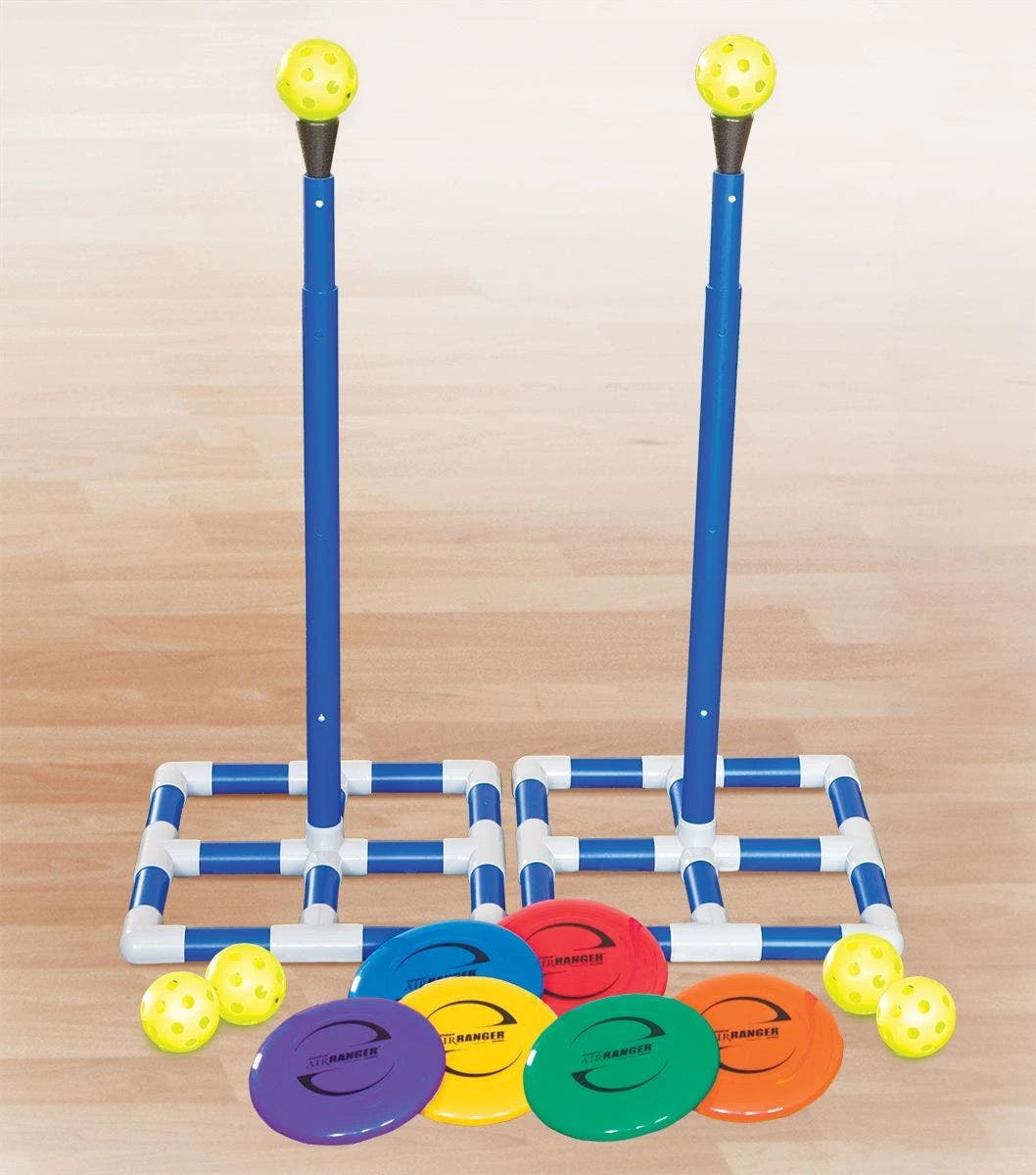 Sets come with 2 pole sets, 6 AirRanger Plastic Discs, 6 yellow plastic balls, and activity instructions with several game ideas and options. The indoor set also includes square bases, while the outdoor set includes ground stakes.