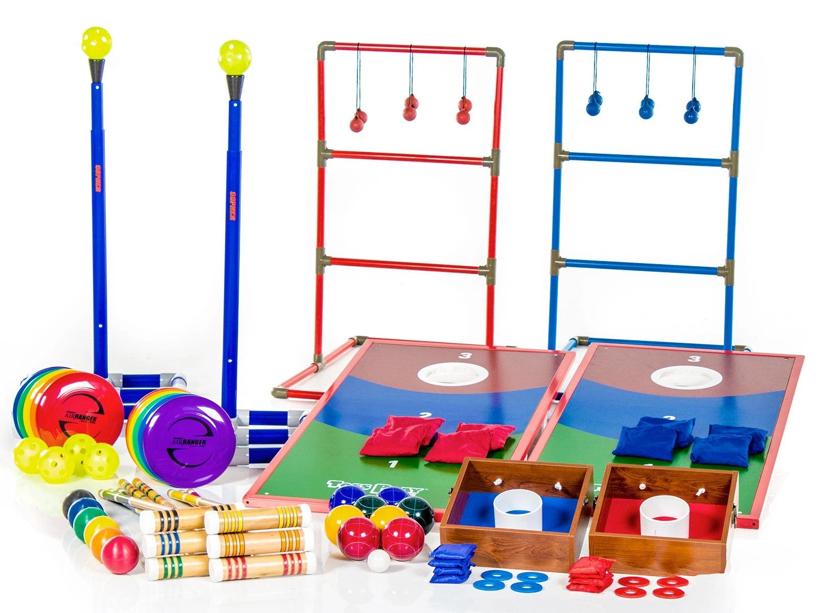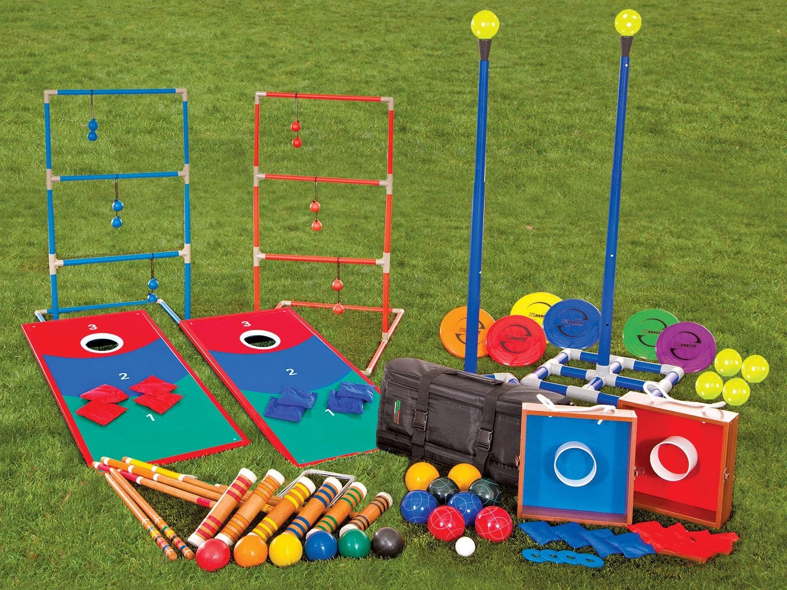 Featuring 6 of the most popular tossing games all rolled into a single convenient set, your students will enjoy hours of fun tossing, catching, aiming, and outscoring their opponents! These fun outdoor kid games include Washer Toss, TripleToss, DiscBonk, Classic Croquet, Medio Bocce, and BagMania. All games come with instructions.