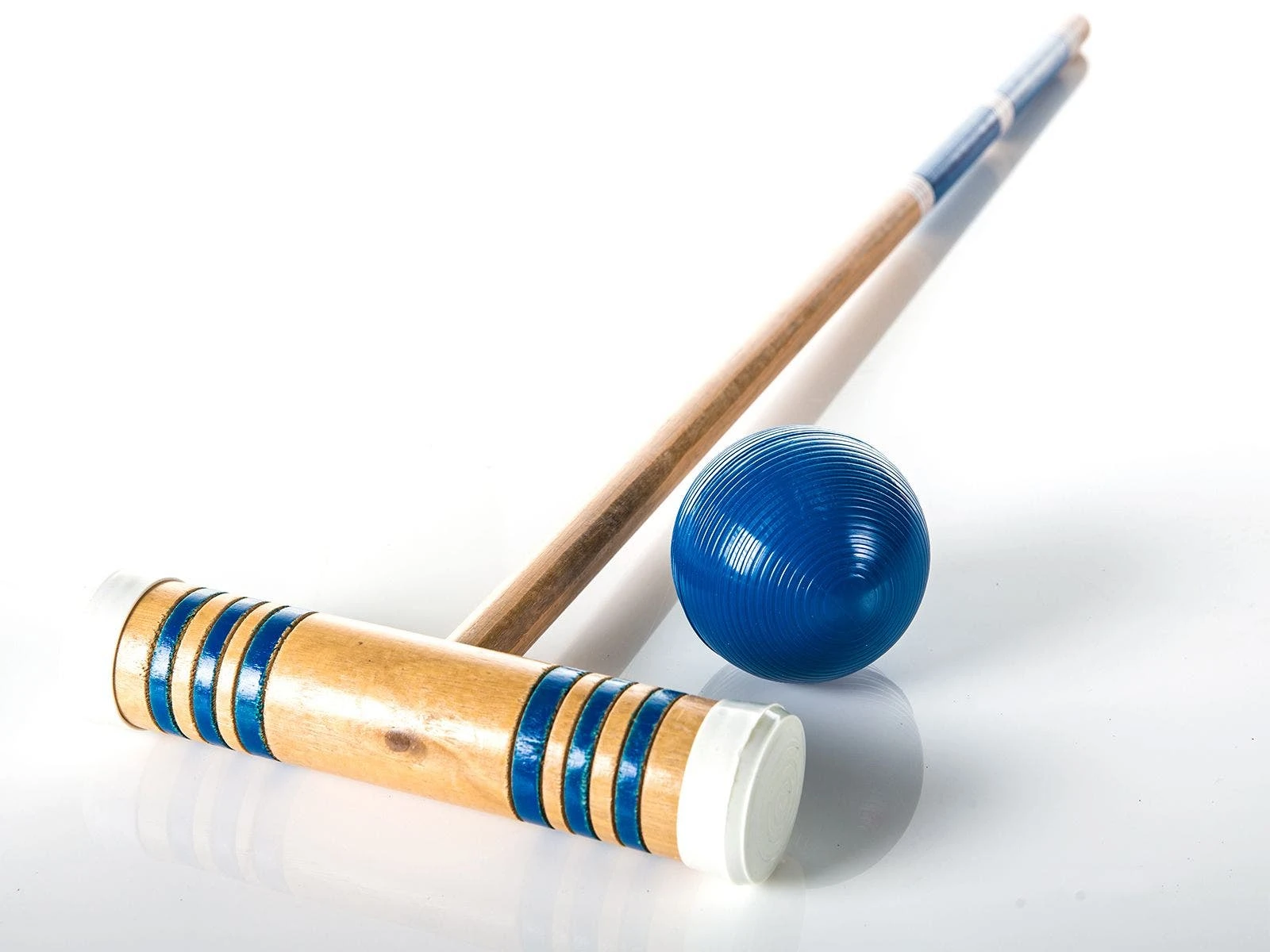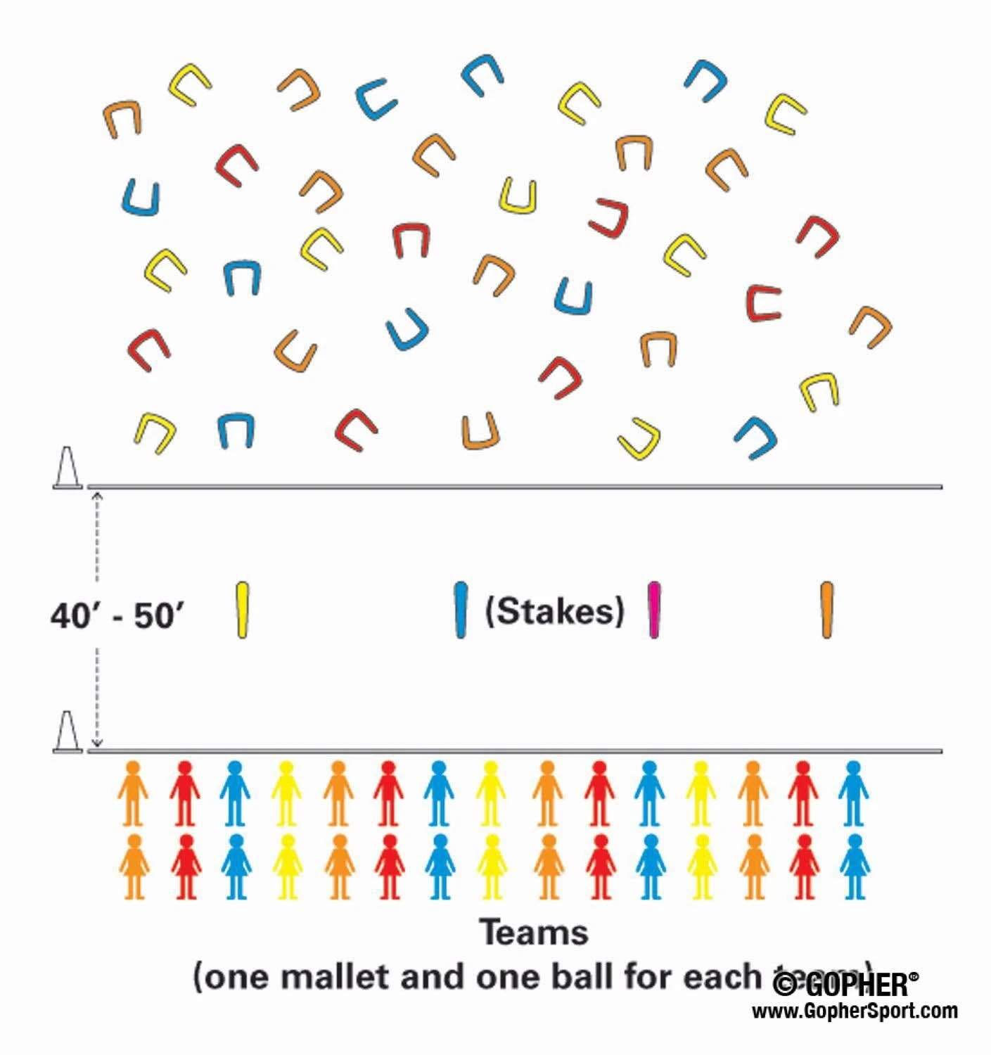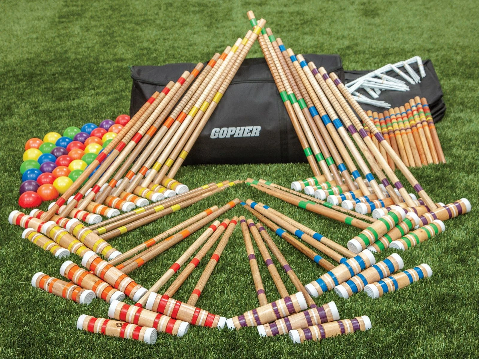 Team-colored mallets feature a textured rubber-capped striking surface, giving students better control of shots during play. Mallet heads and shafts are made of contoured hardwood designed for long-lasting play. Hard polymer plastic balls withstand institutional use outdoors without losing their shape or color.