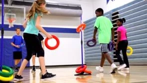 At the signal, players throw their team’s colored rings, trying to land them on the 6 teetering poles in the center of the play area. Teams strategize where to throw, because the longer the run of consecutive rings on a pole, the more points a team earns (2 rings = 1 point, 3 rings = 2 points). Other teams can block points by landing a ring on a pole and interrupting the color run. The more rings hit poles, the more the poles teeter, creating a bigger challenge to score.