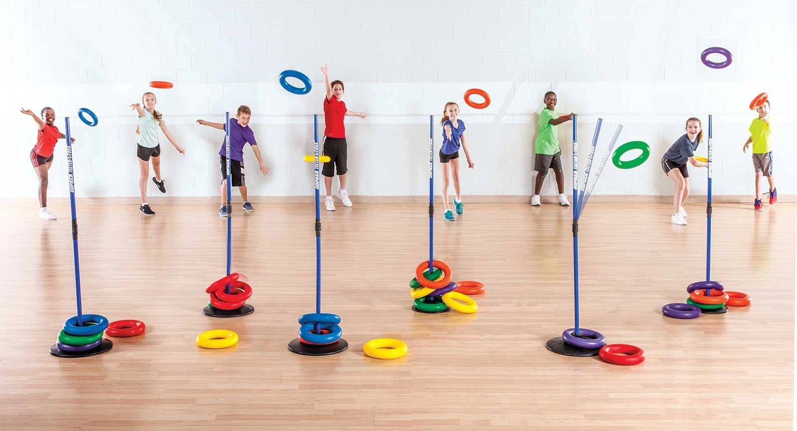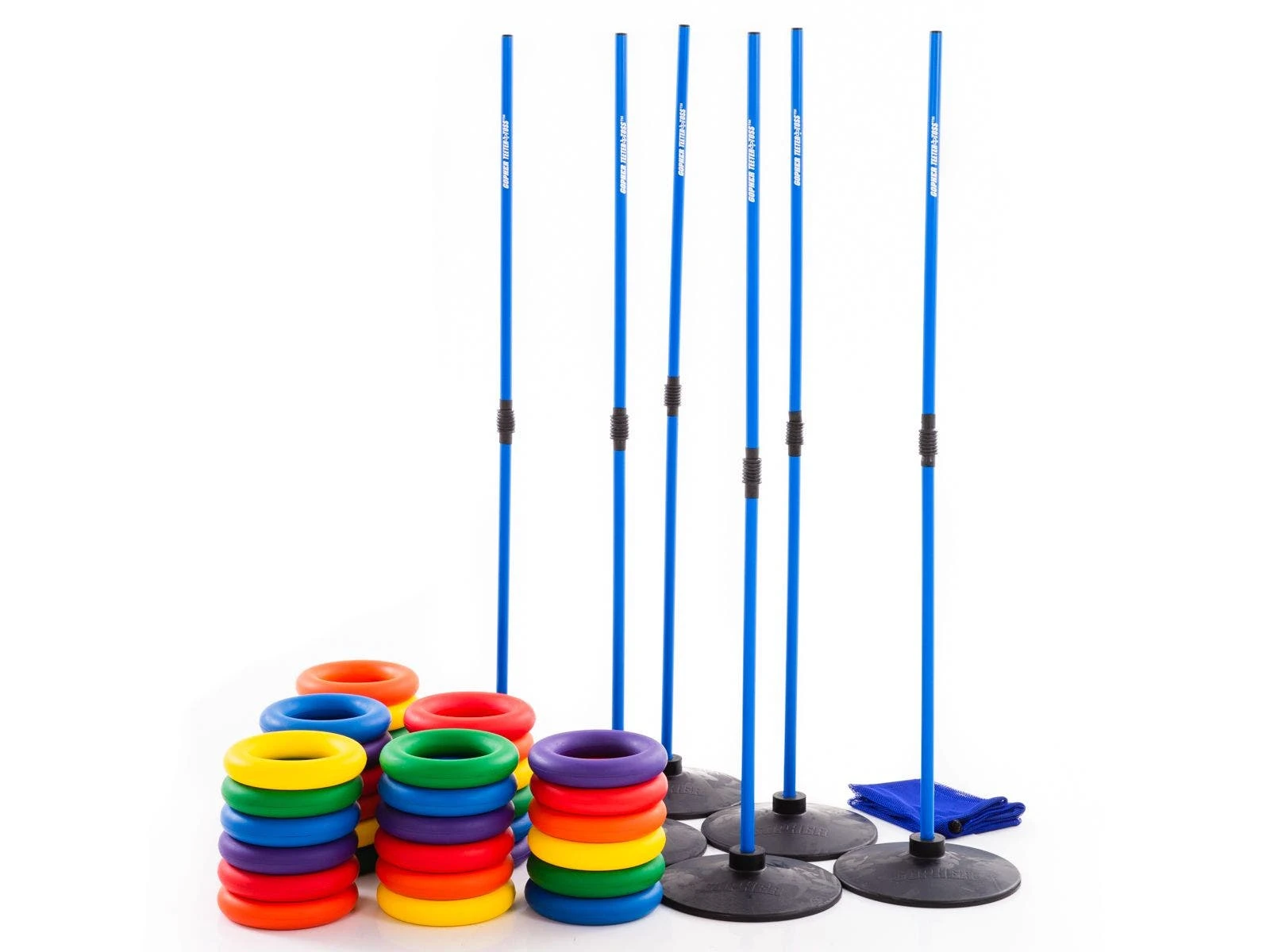 Set includes 6 poles (60″H x 1″ dia), 6 bases, 36 Rainbow rings (6 of each color), VersaBag mesh storage bag, and activity instructions.