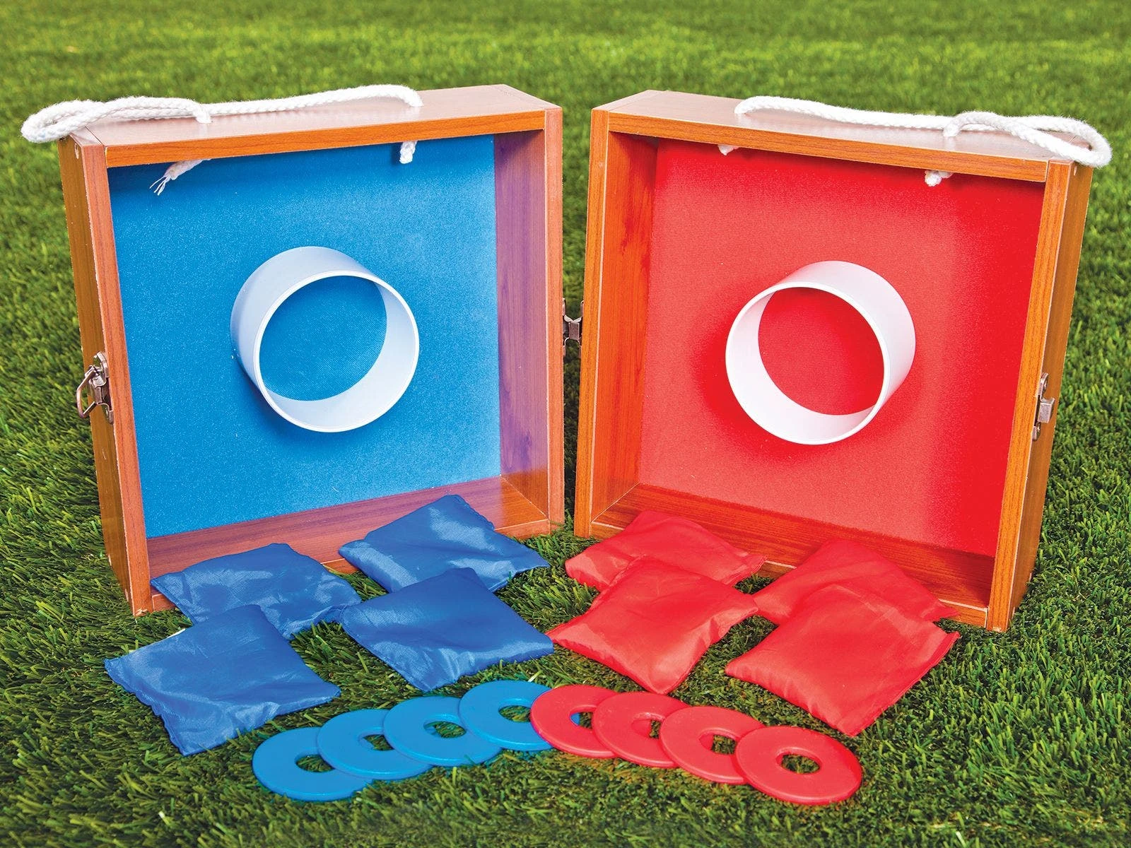 Set includes 8 washers and 2 wooden targets that latch together to form a storage case.