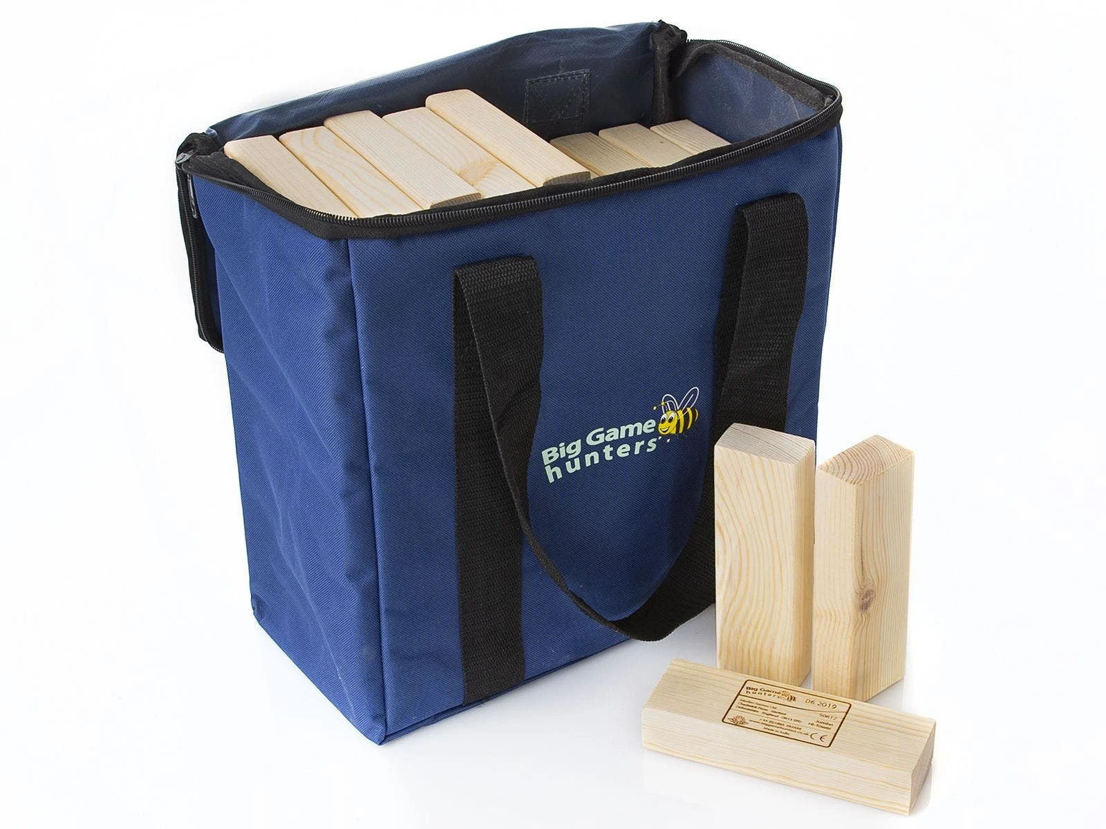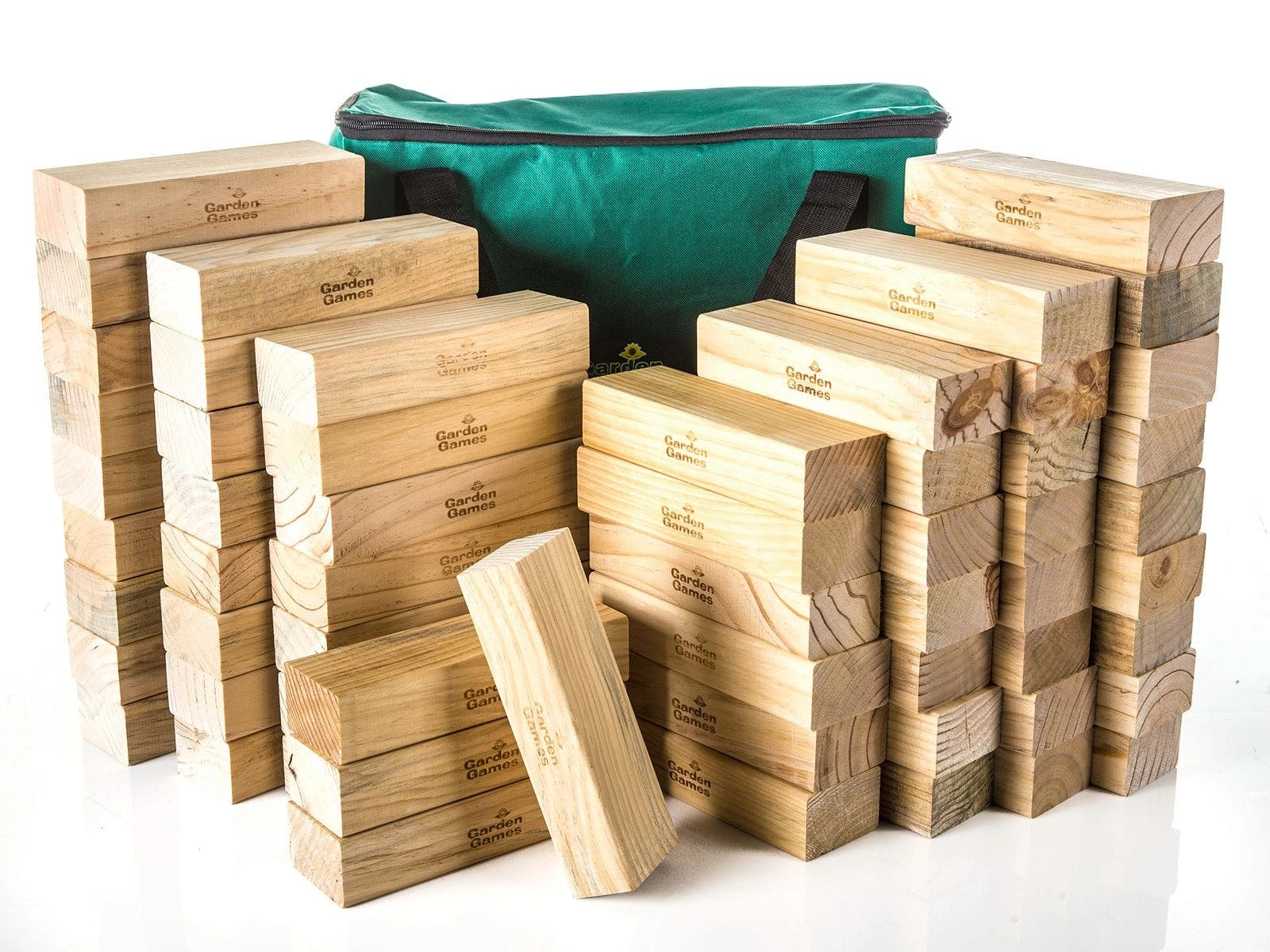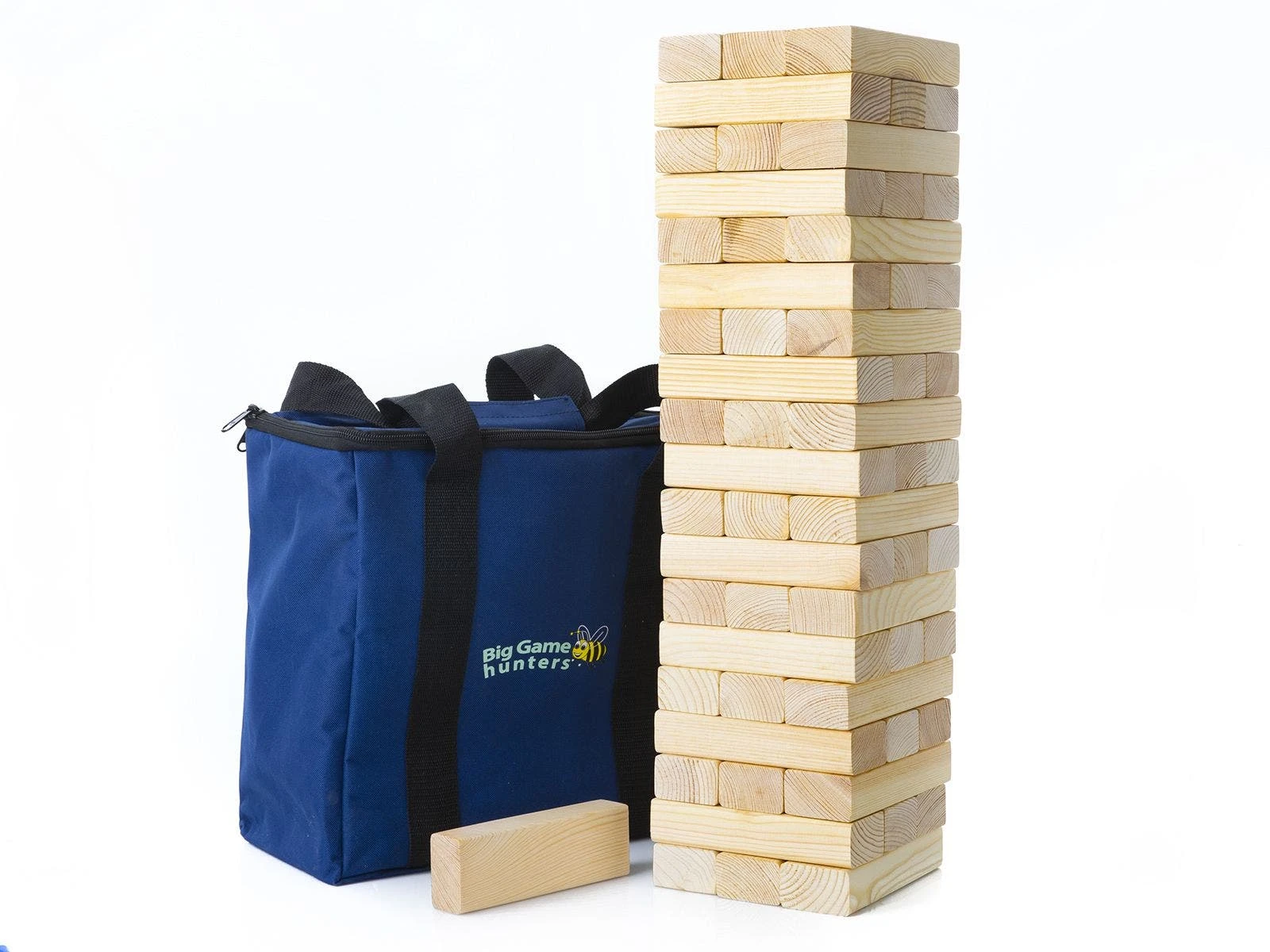 Sets include 58 pine wood blocks and a storage bag. Standard blocks (8″L x 3″W x 2″H; 11 oz) create a tower 3’H. Junior blocks (6″ x 2″W x 1-1/4″H; 4 oz) create a tower 2’H.