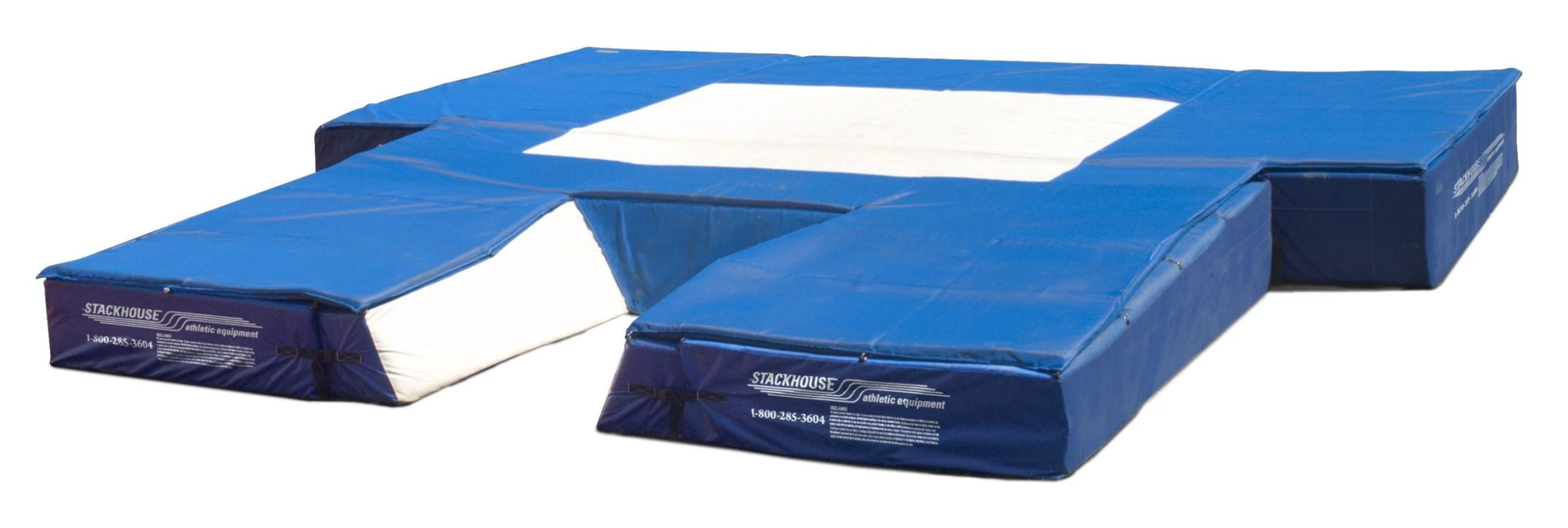 This 32″H pit is a perfect height for high school vaulters. It features foam modules that vary in density to absorb impact from vaulters and then “spring back” to prevent worn or lumpy spots from forming. Foam is wrapped in an 18 oz vinyl cover with double-stitched seams that stands up to routine use and abuse. A 2″ polyurethane spike-resistant top protects the mat further and eliminates spots for water or dirt to seep in. Durable handles provide convenient mobility. Meets NFHS specifications. 20’L x 21’W x 32″H.