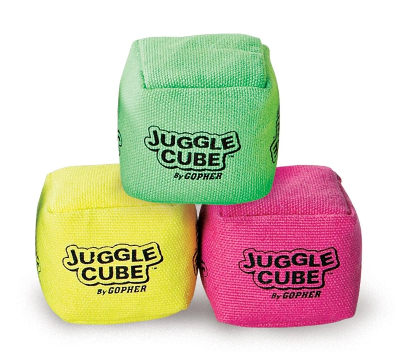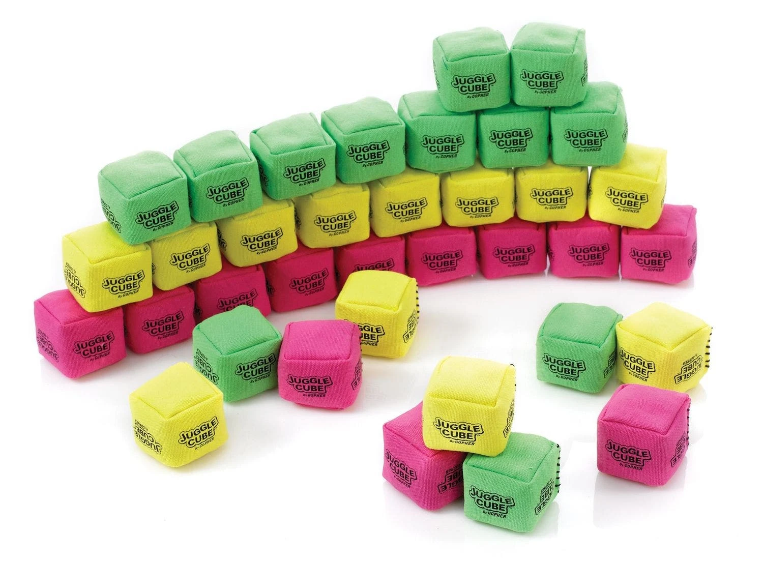 Cubes are a great intermediate option for juggling. Use them as a transition between scarves (beginner) and small balls (advanced). The cube shape provides a more tactile grip, allowing students to focus on their timing instead of concentrating on handling. Plus, even when dropped, cubes won’t roll or bounce away!