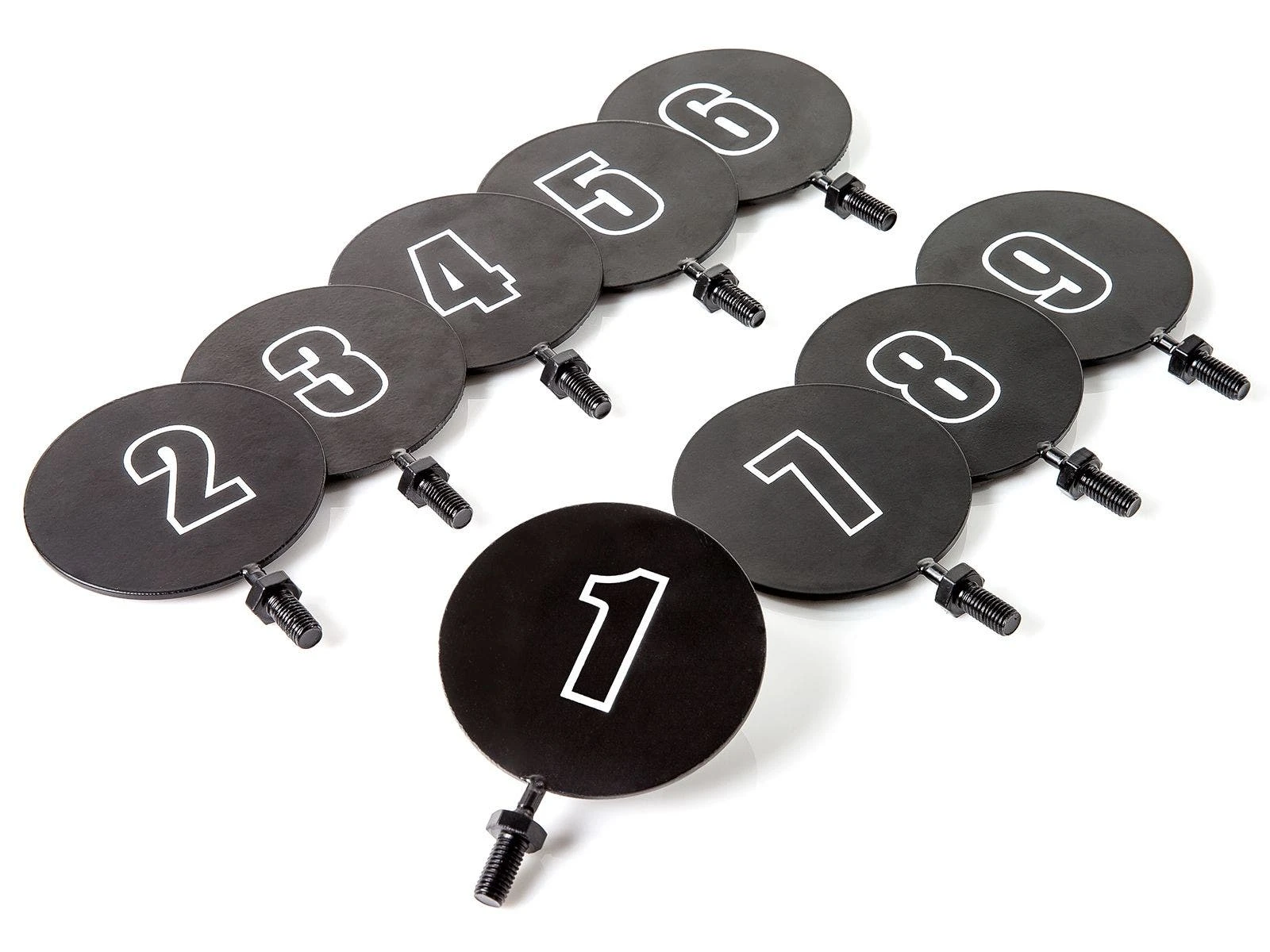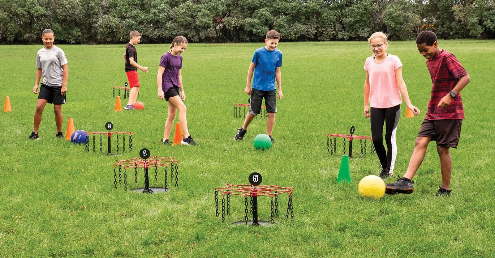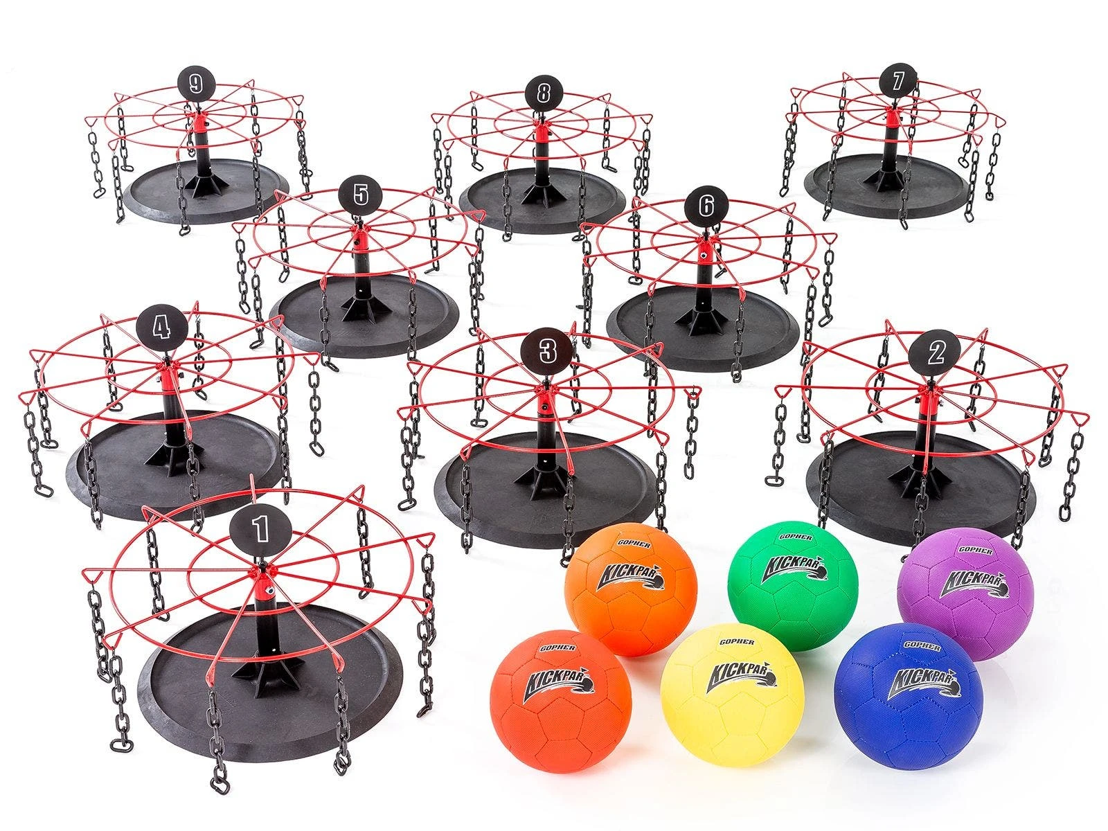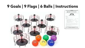 Set includes 9 goals (22-1/2” dia; 11 lb), 9 numbered metal goal flags, 6 balls (8.25” dia), and activity instructions with game variations. Individual Goal with an unnumbered flag and extra balls also sold separately.