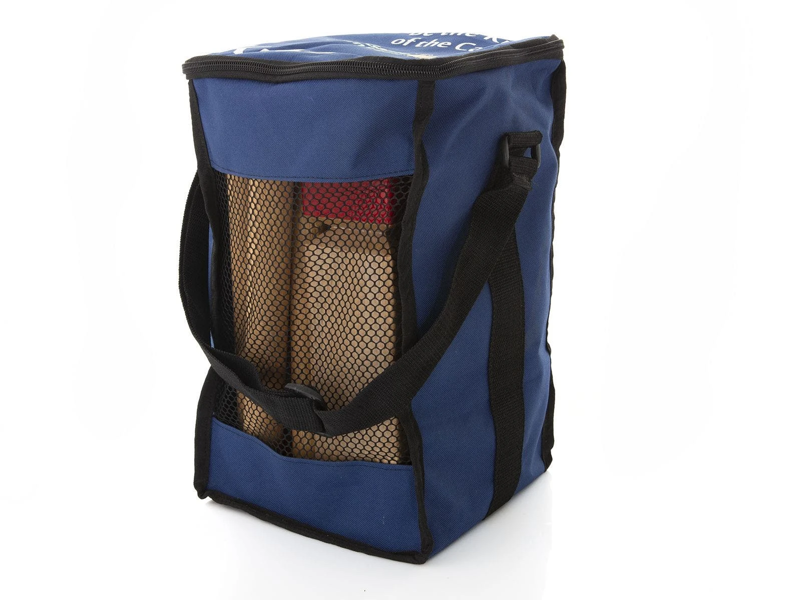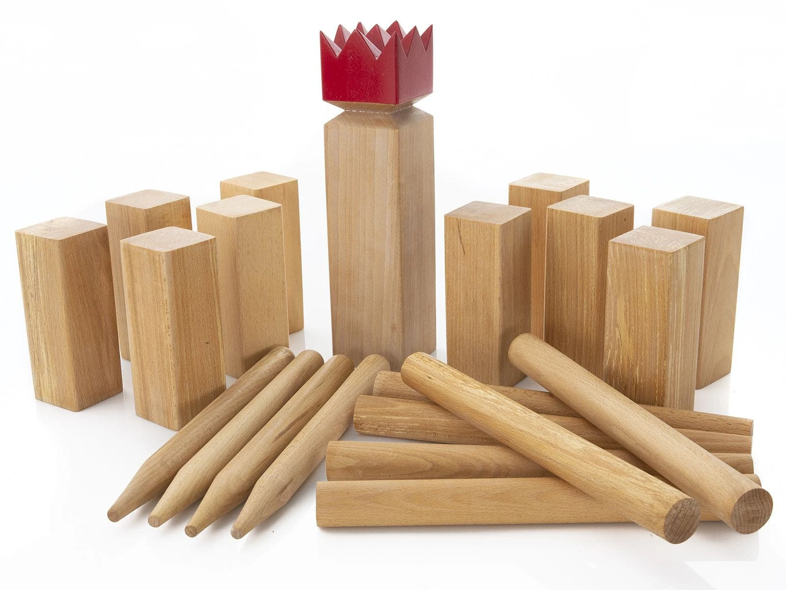 All pieces are made of solid, varnished Beech wood that endures through every toss during institutional use. Set includes 1 king (12″H), 10 kubbs (6″H), 4 corner poles (12″H), 6 throwing batons (12″L), a carrying bag for easy transport and storage, and activity instructions.