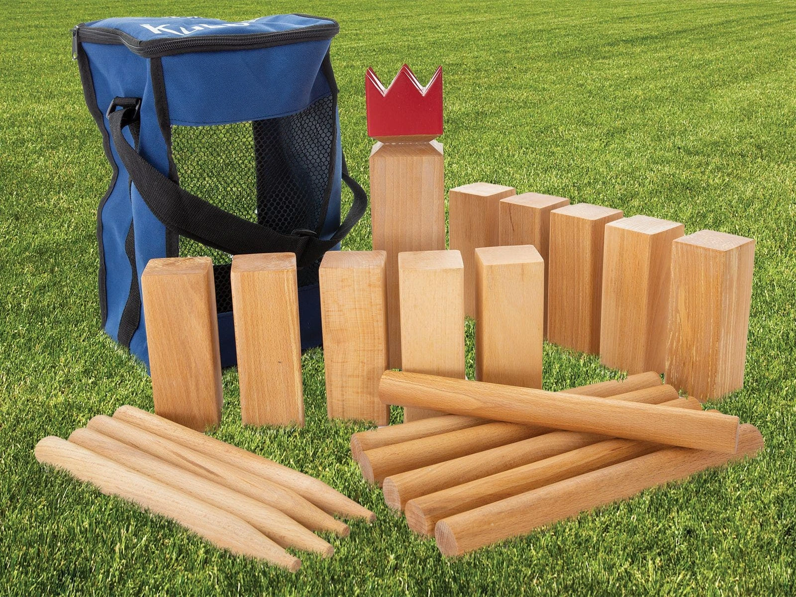 During a kubb lawn game, teams take turns throwing wooden batons at the kubbs lined up along the other team’s baseline on the other end of the play area. Any kubbs that are knocked down are then thrown into the other team’s half of the field where they are reset. The opposing team then knocks down the field kubbs before targeting those remaining along the baseline. If a baseline kubb is knocked down before all field kubbs are eliminated, the baseline kubb is reset. The first team to knock over all the other team’s kubbs and the king in the middle of the field wins! If a team knocks over the king before all of the other team’s kubbs, the other team automatically wins.