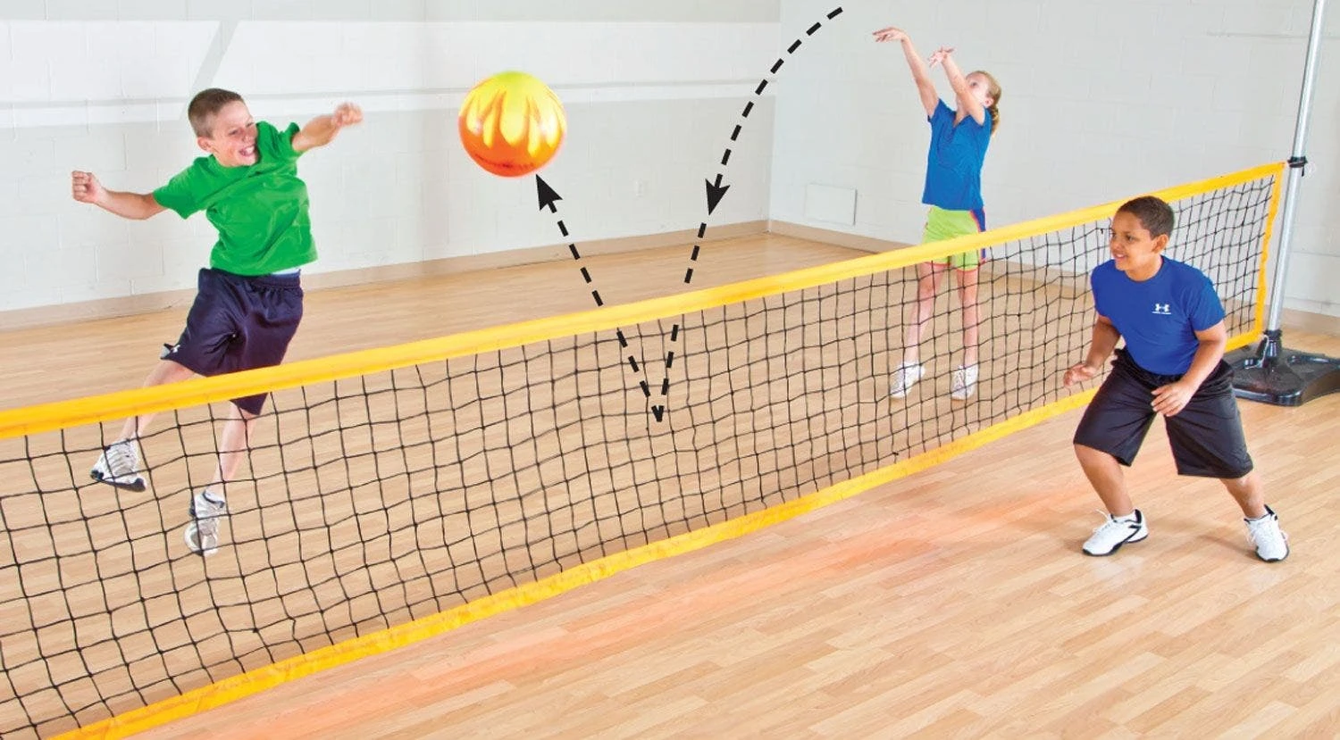 The standard court typically measures 78’L x 36’W. Play begins after a player serves the ball. If the ball doesn’t make it over the net, touches a player of the serving team, strikes something other than the net, lands out of bounds, or the server steps out of bounds, the other team earns the serve. The ball must bounce on the court before every strike. Similar to traditional volleyball, no player can hit the ball twice consecutively, and each team gets up to 3 hits when the ball is on its side. This game uses rally scoring, so a team scores a point every time the ball is served. The first team to 21 points wins.
