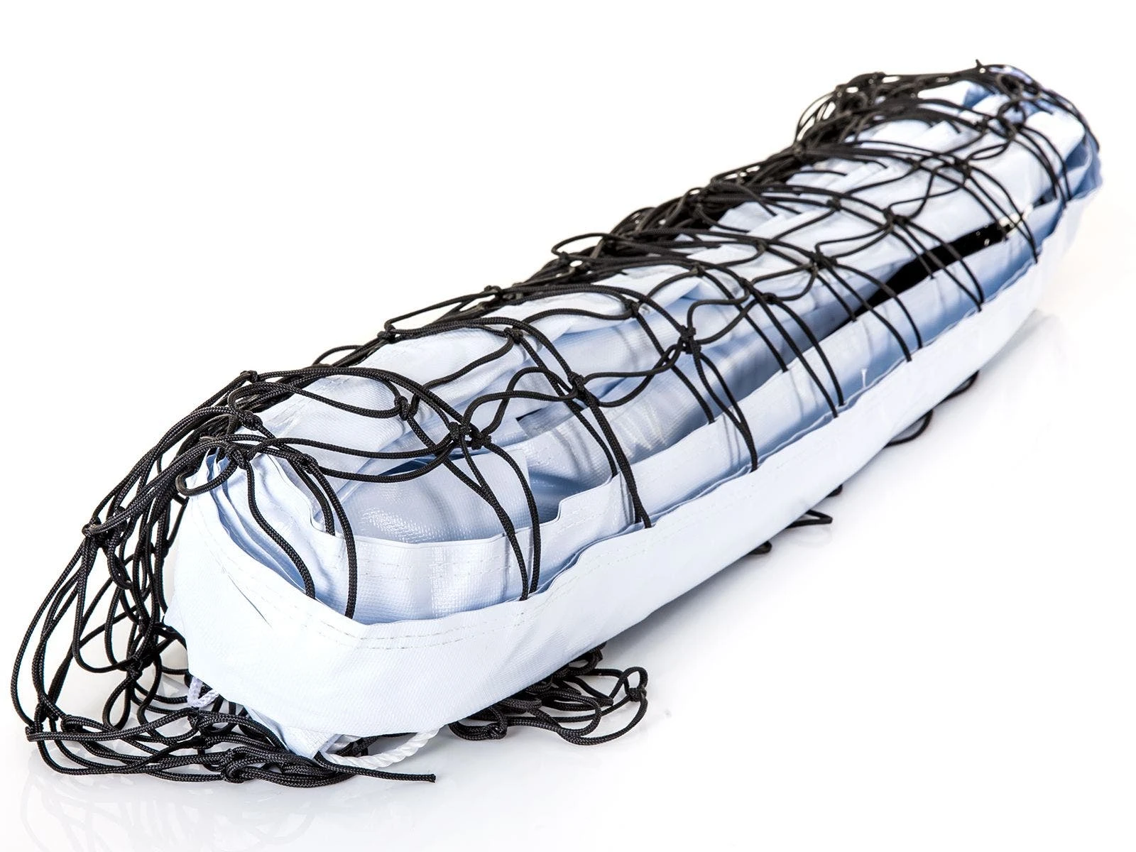 - 2.5 mm knotted nylon flexabar-treated net with 4” black mesh and riveted corners
