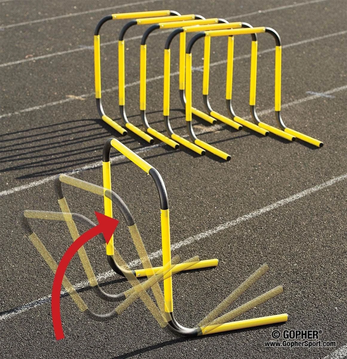 Teachers and students no longer have to worry about going and setting downed hurdles back up to keep drills running smoothly. When hit, the hurdles tip forward then roll back into position thanks to specially rounded corners.