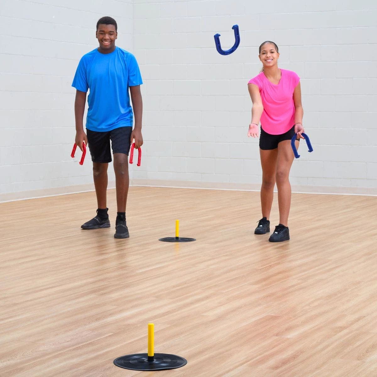 A great option for new and younger students, these rubber horseshoes are lighter and easier to throw than traditional steel shoes. Use this set indoors on gym floors, or outside on grassy and blacktop surfaces!