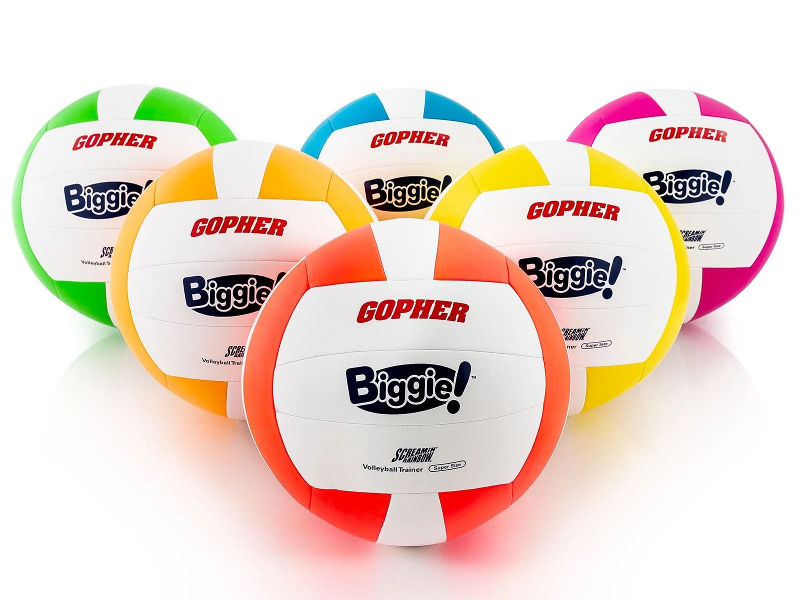 The standard 18-panel cover gives the ball an official look, while soft foam backing eliminates stinging. At 16” dia, the Biggie! Is 20% larger than standard balls, allowing for increased accuracy and more fun practicing skills on the court. A latex rubber butyl bladder is ultra-light and keeps its shape class after class. Available in a Set of 6.