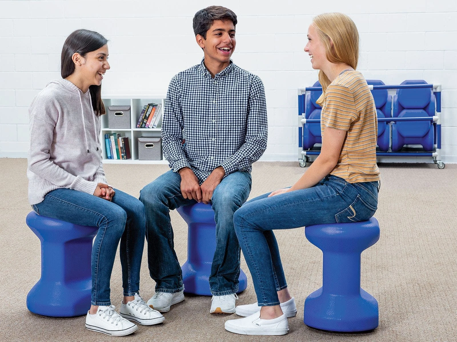 When the lesson is done, crisscross these uniquely-shaped stools to stack for storage. To tidy your classroom quicker, a custom cart (sold separately) makes transportation a breeze. Available individually, in a set of 6, and a comprehensive pack of 24 with cart. Cart is 59-1/2”L x 22”W x 33-1/2”H; 34 lb. Patent Pending.
