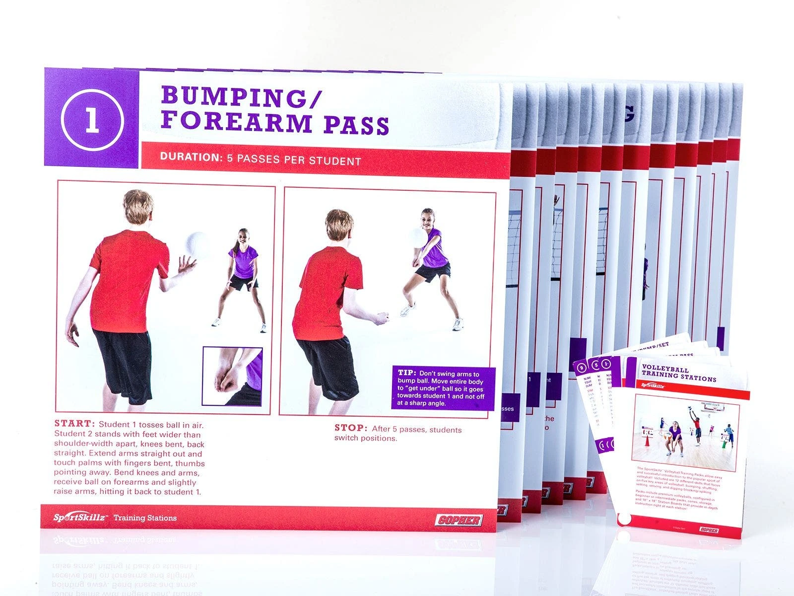 Set up an exciting volleyball circuit to easily introduce students to the sport. These station boards and teacher cards clearly demonstrate volleyball skills within the key areas of bumping, shuffling, setting, serving, and digging/blocking/spiking. Each board focuses on one activity, featuring step-by-step instruction and large, crisp images for self-directed learning.