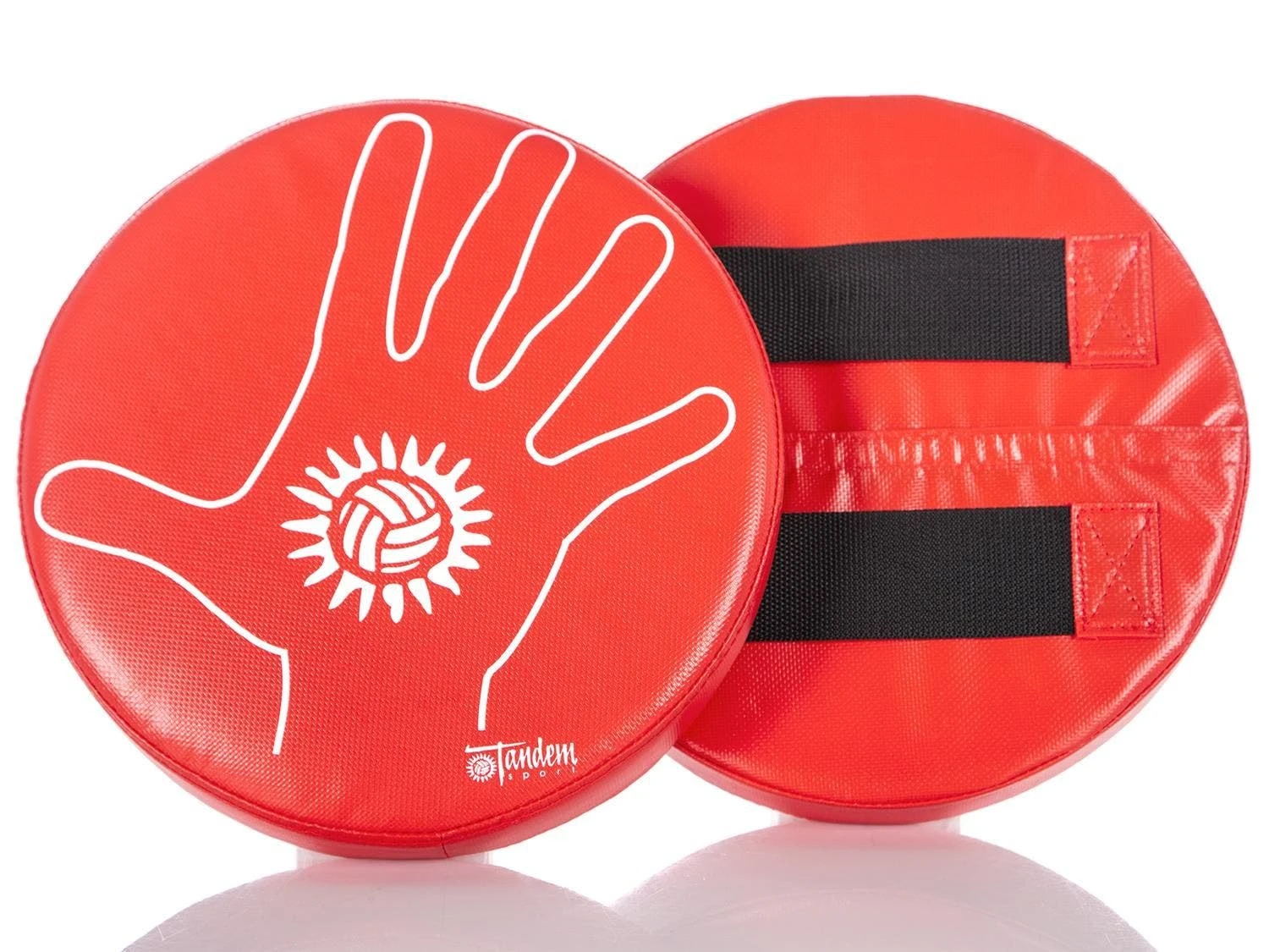 This blocking set includes two round foam pads to practice independent hand placement. Each pad features an extended hand graphic on the front to show proper hand placement and give players a target. Use independently or together. Two reinforced hand straps on the back give instructors a secure hold. Polyvinyl cover stands up to routine use during team practices or PE classes. Sold in pairs. 12″ dia x 2″D.